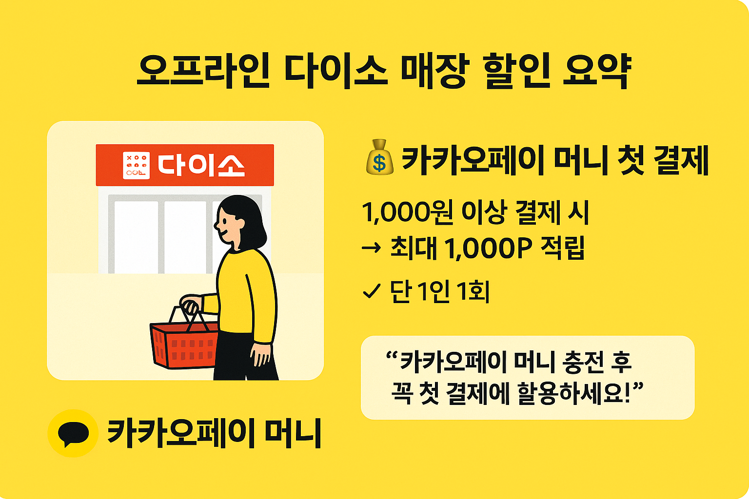 “다이소는 역시 매장에서 직접 봐야지~” 하시는 분들께는 카카오페이 머니로 결제 시 혜택이 있어요. 특히