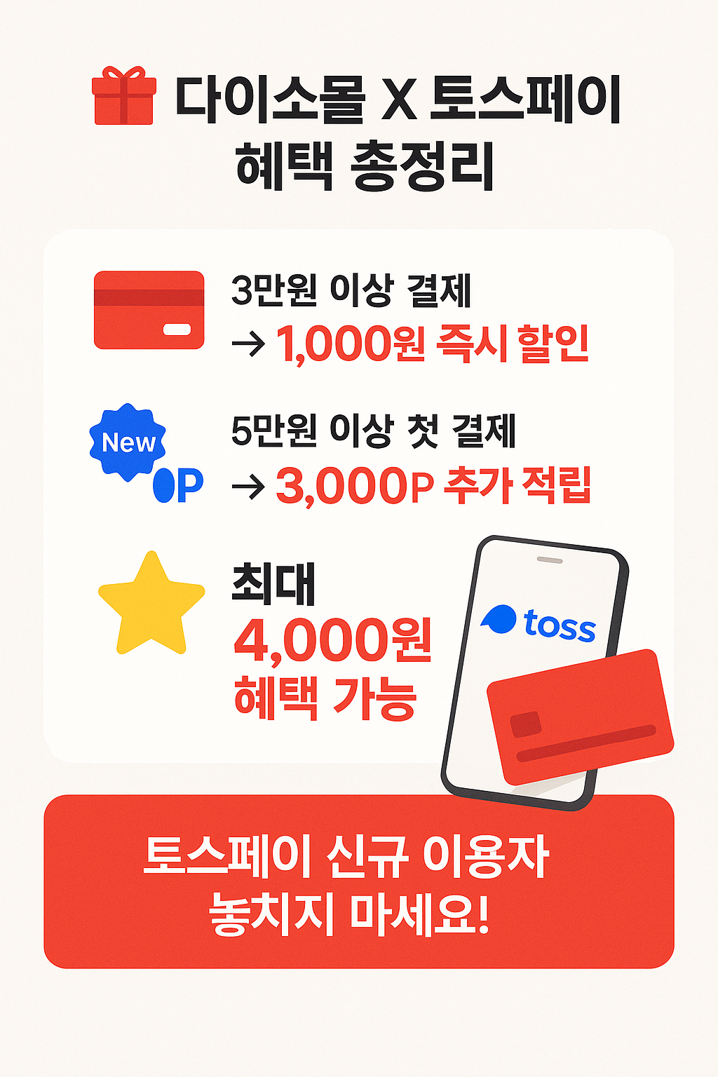 | 다이소몰에서 5만원 이상 구매 | 토스페이 첫 결제 + 일반 할인 동시 적용 |