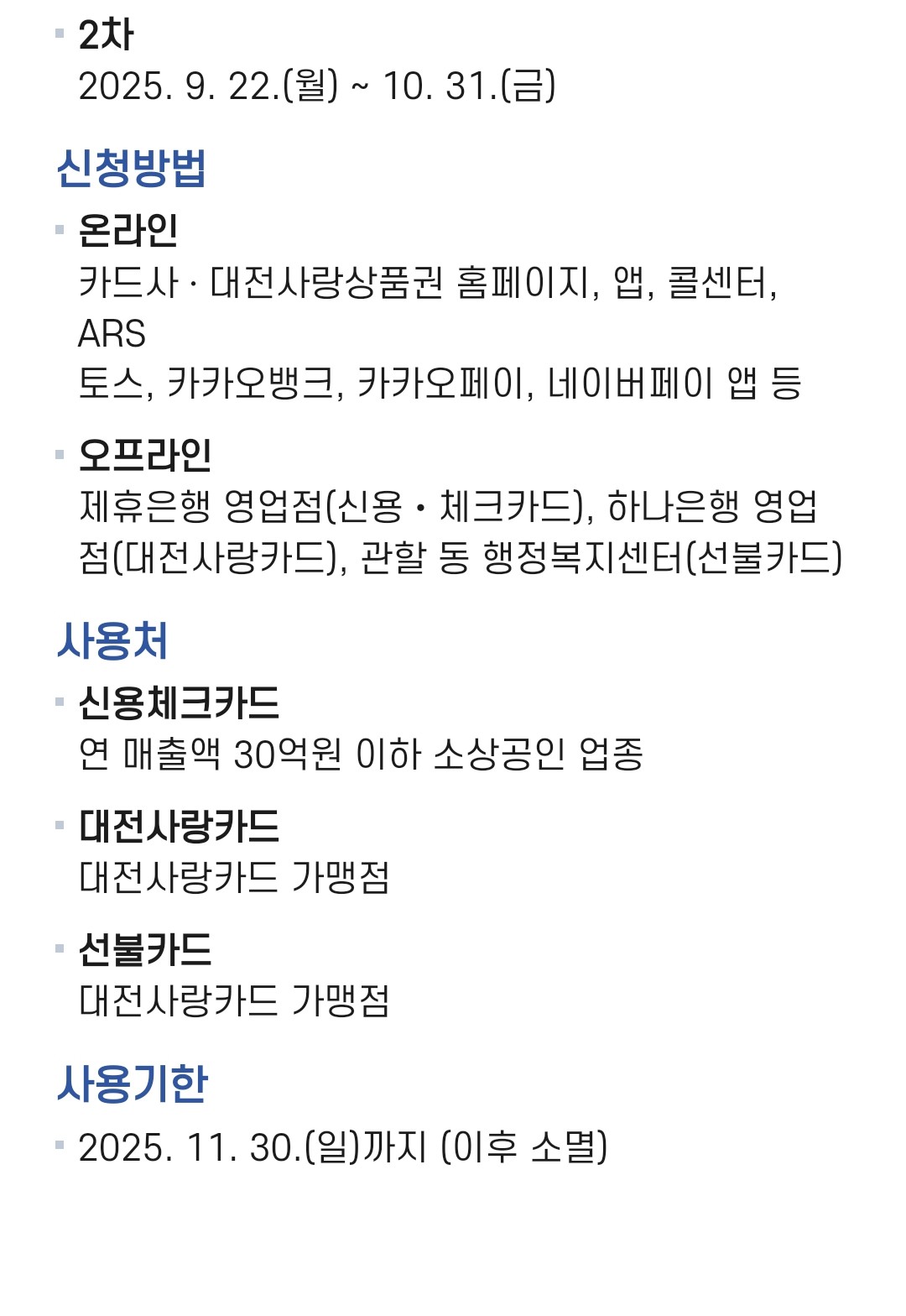 대전 내 온통대전 가맹점에서만 사용 가능하며, 대형마트나 백화점은 제외될 수 있습니다.