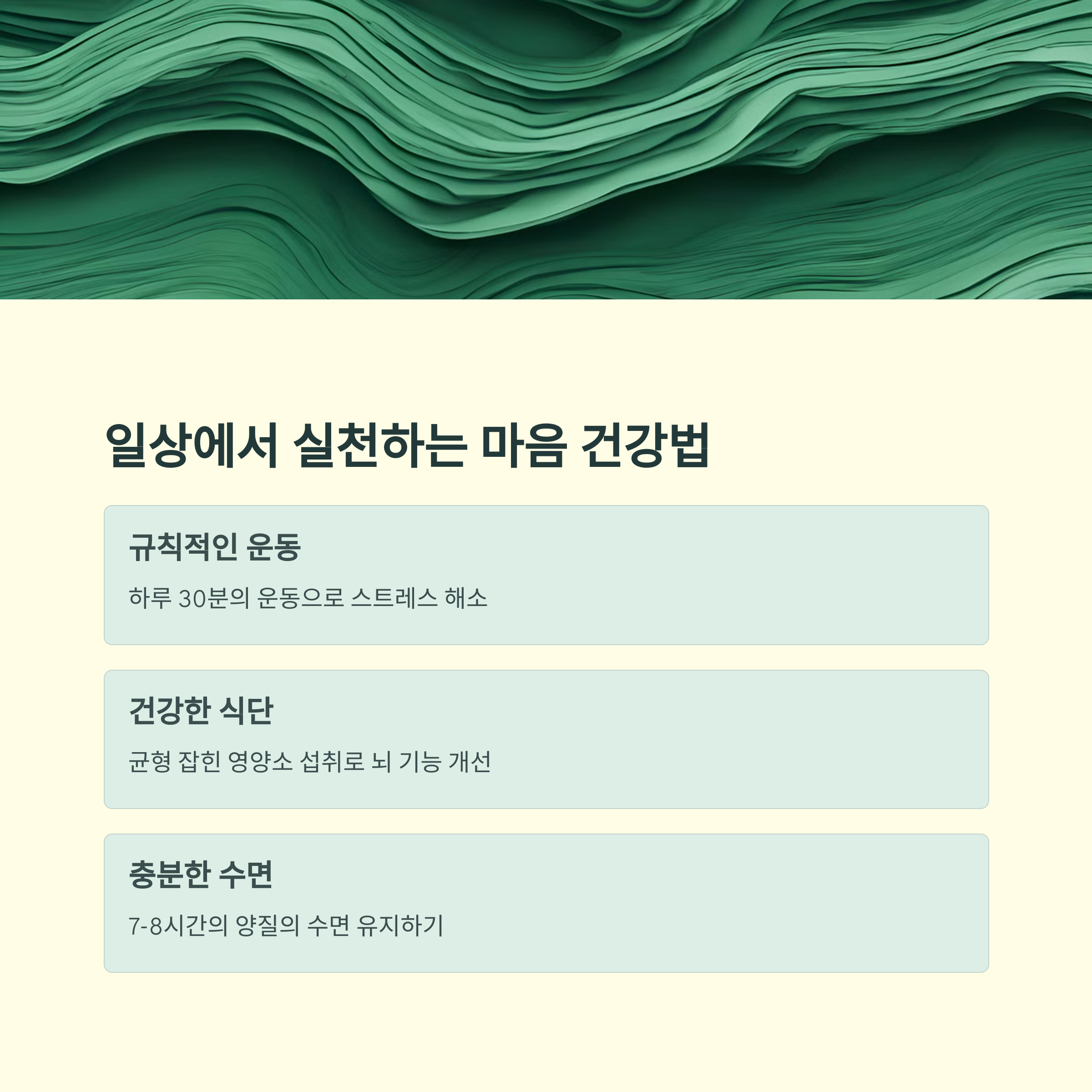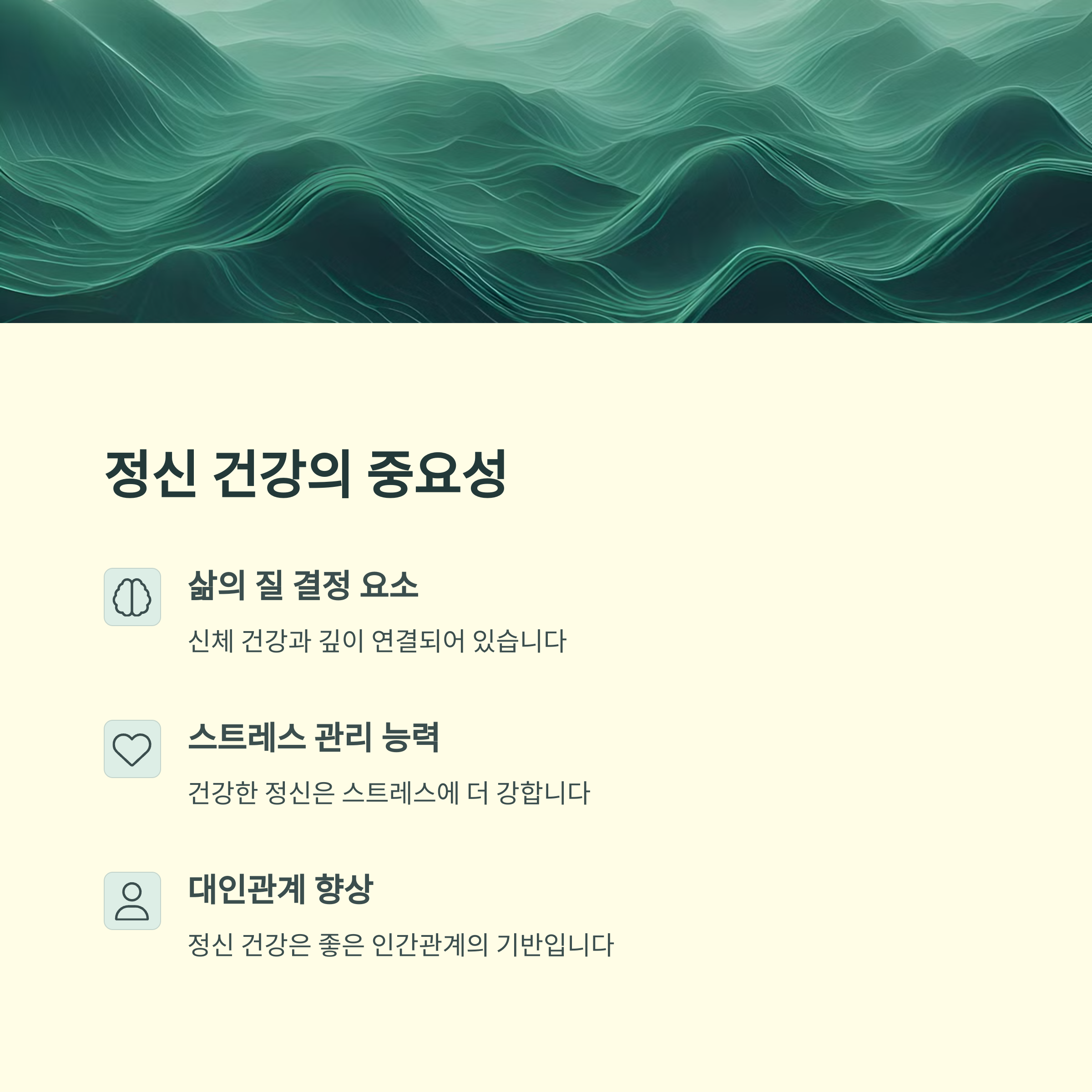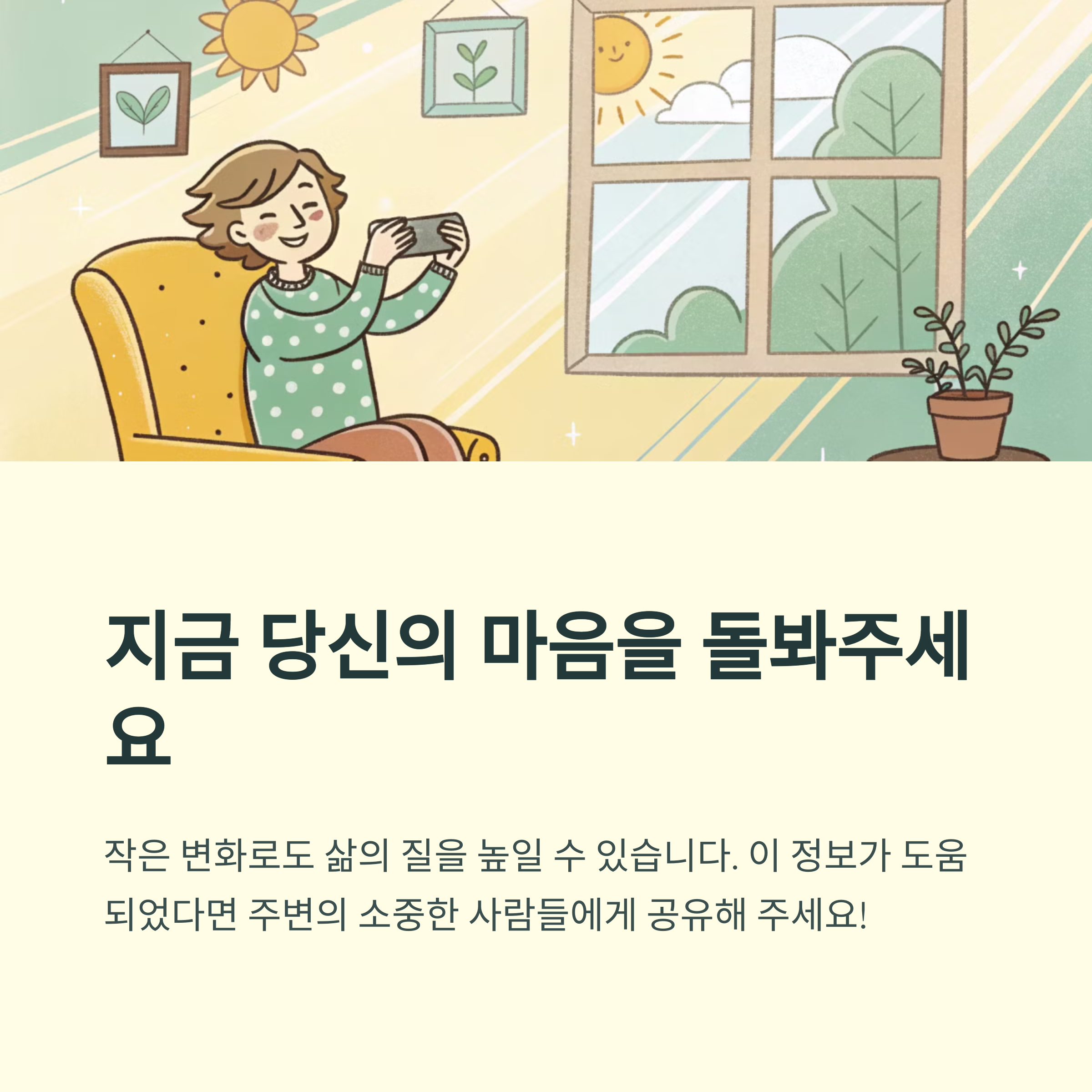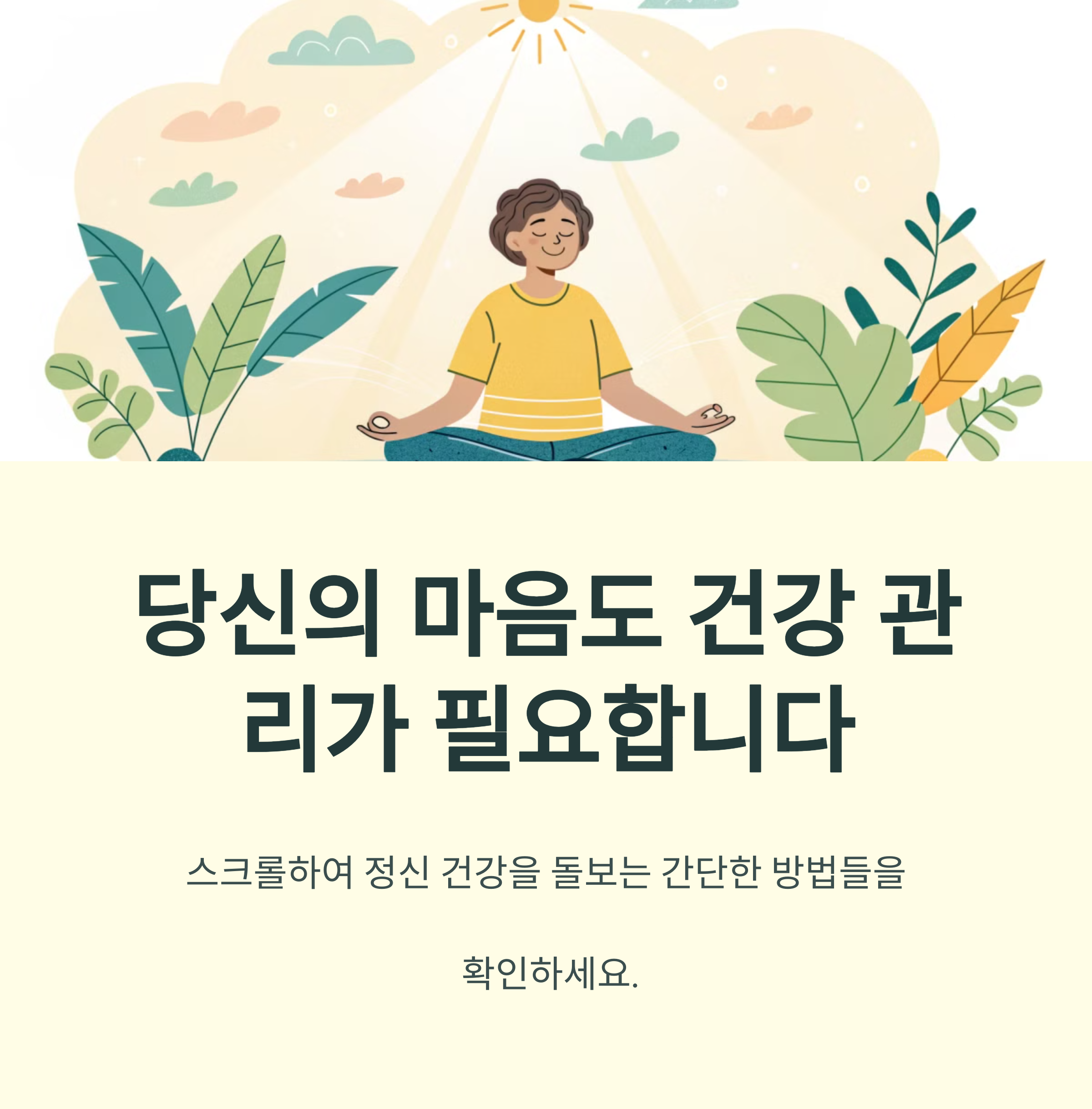 정신 건강은 우리가 매일 챙겨야 할 중요한 부분입니다. 작은 변화로도 삶의 질을 높일 수 있습니다. 혹시 힘든 순간이 온다면, 주저하지 말고 주변의 도움을 요청하세요. 도움을 받는 것은 약한 것이 아니라, 더 나은 삶을 위한 현명한 선택입니다.