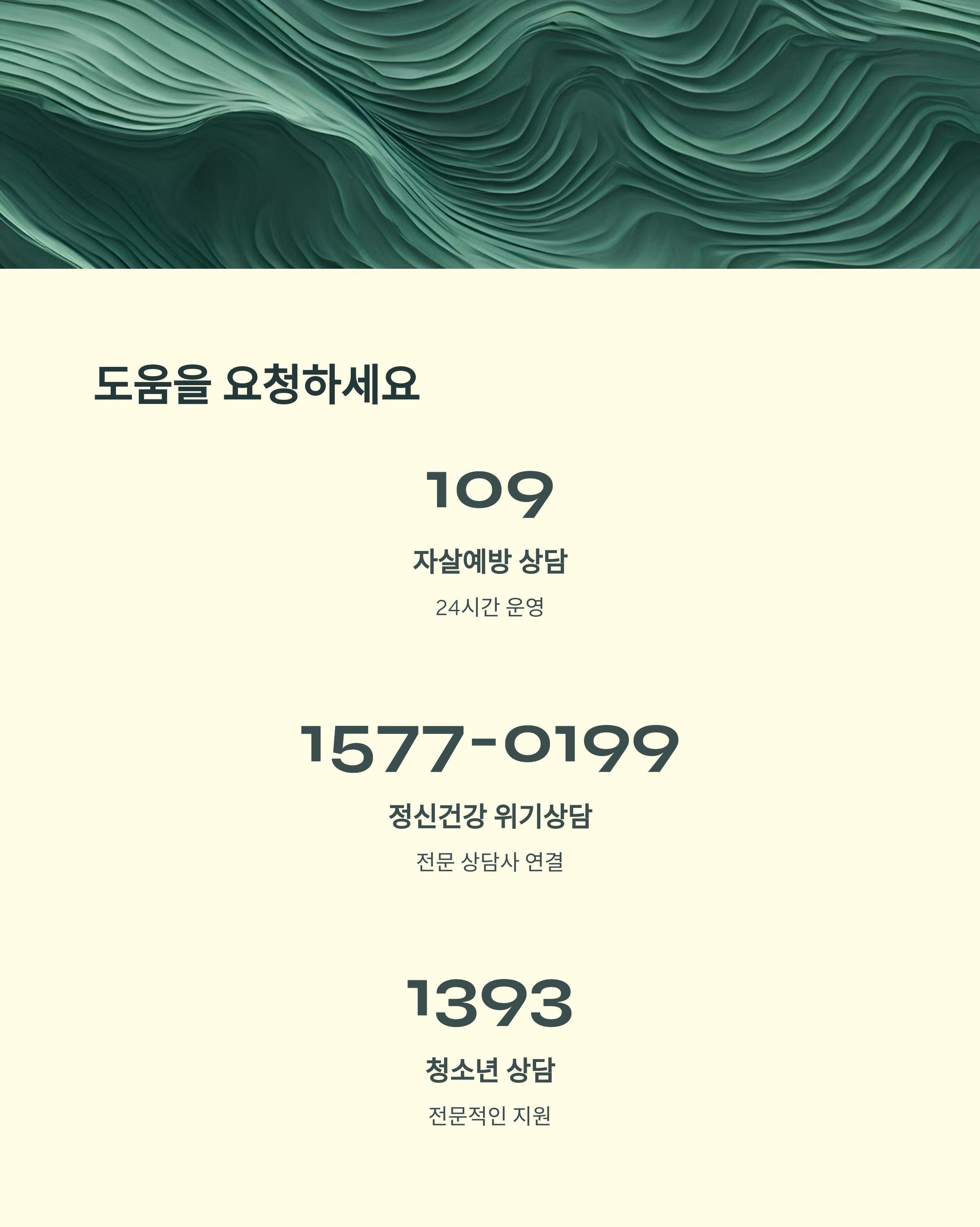지금 당신의 마음 건강을 한 번 돌아보세요. 그리고 필요하다면 언제든 도움을 요청하세요.