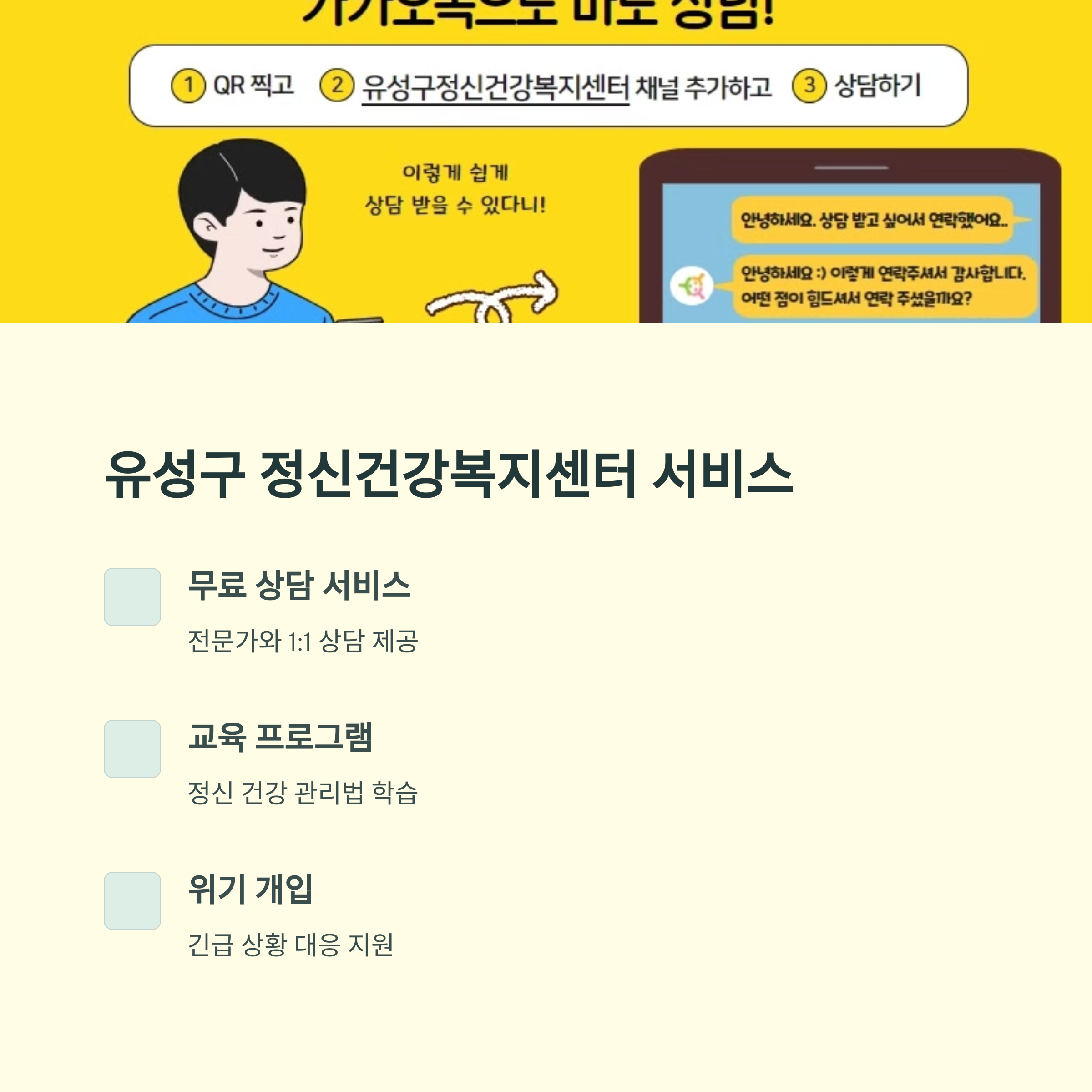 유성구 정신건강복지센터에서는 주민들을 위한 다양한 정신 건강 서비스를 무료로 제공합니다.