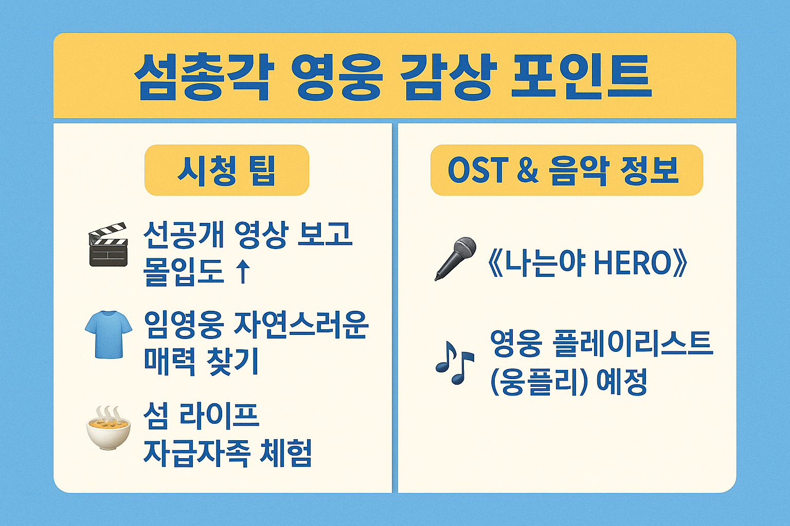 음악도 역시 ‘임영웅 예능’답게 감성 충만! 메인 OST는 정규 2집 수록곡 〈나는야 HERO〉로, 섬의 풍경과 어우러지는 뮤직비디오가 방송 중 첫 공개됐어요. 앞으로 방송에서 ‘영웅 플레이리스트(웅플리)’라는 감성 음악 큐레이션 코너도 예정돼 있어 팬이라면 정말 기대되는 포인트!