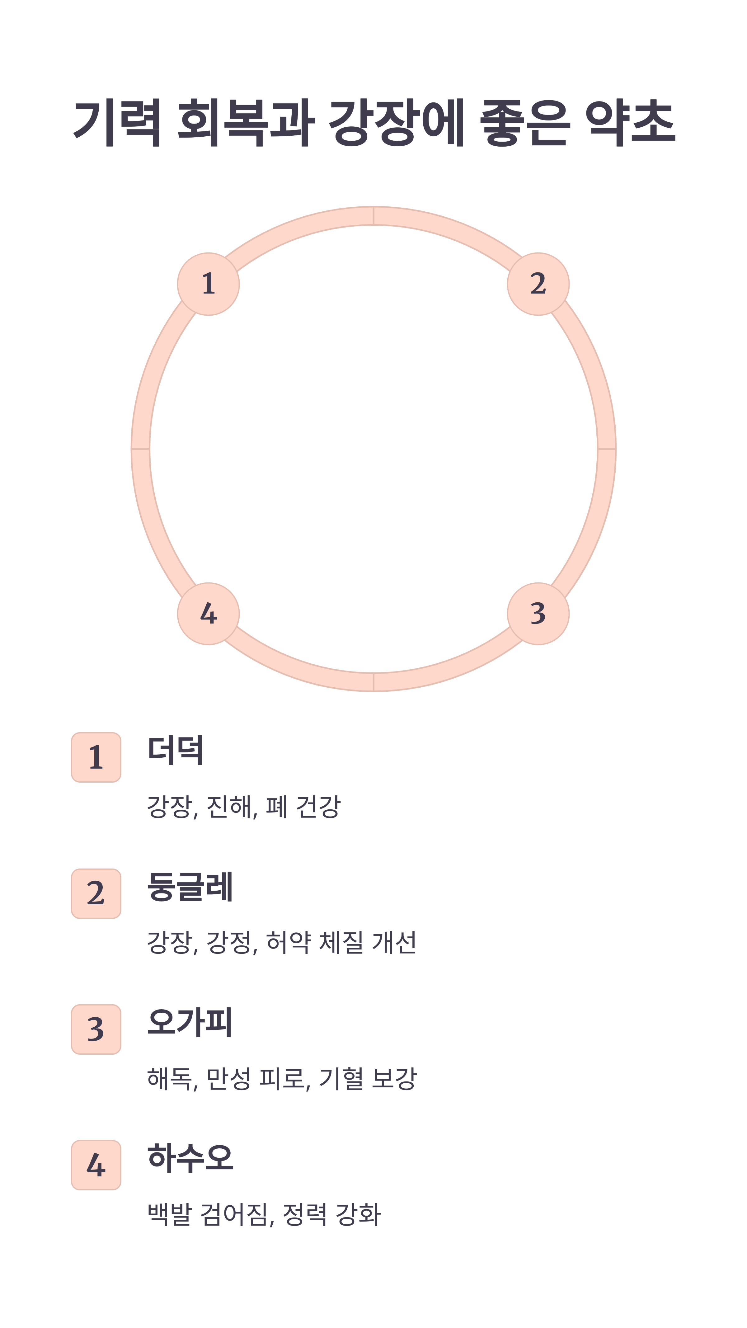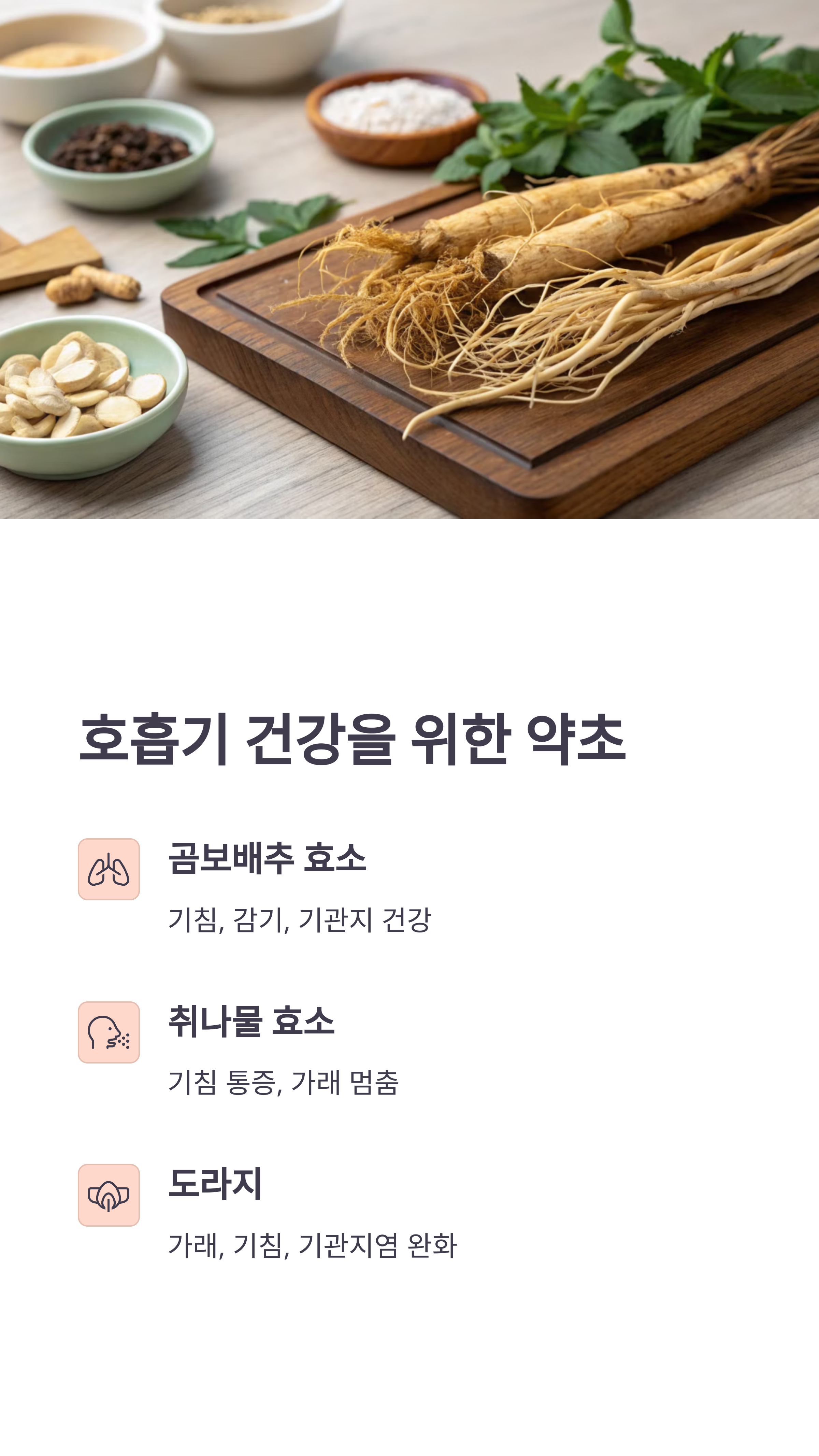 | 도라지 | 가래와 기침을 완화하며 기관지 건강을 돕습니다. |