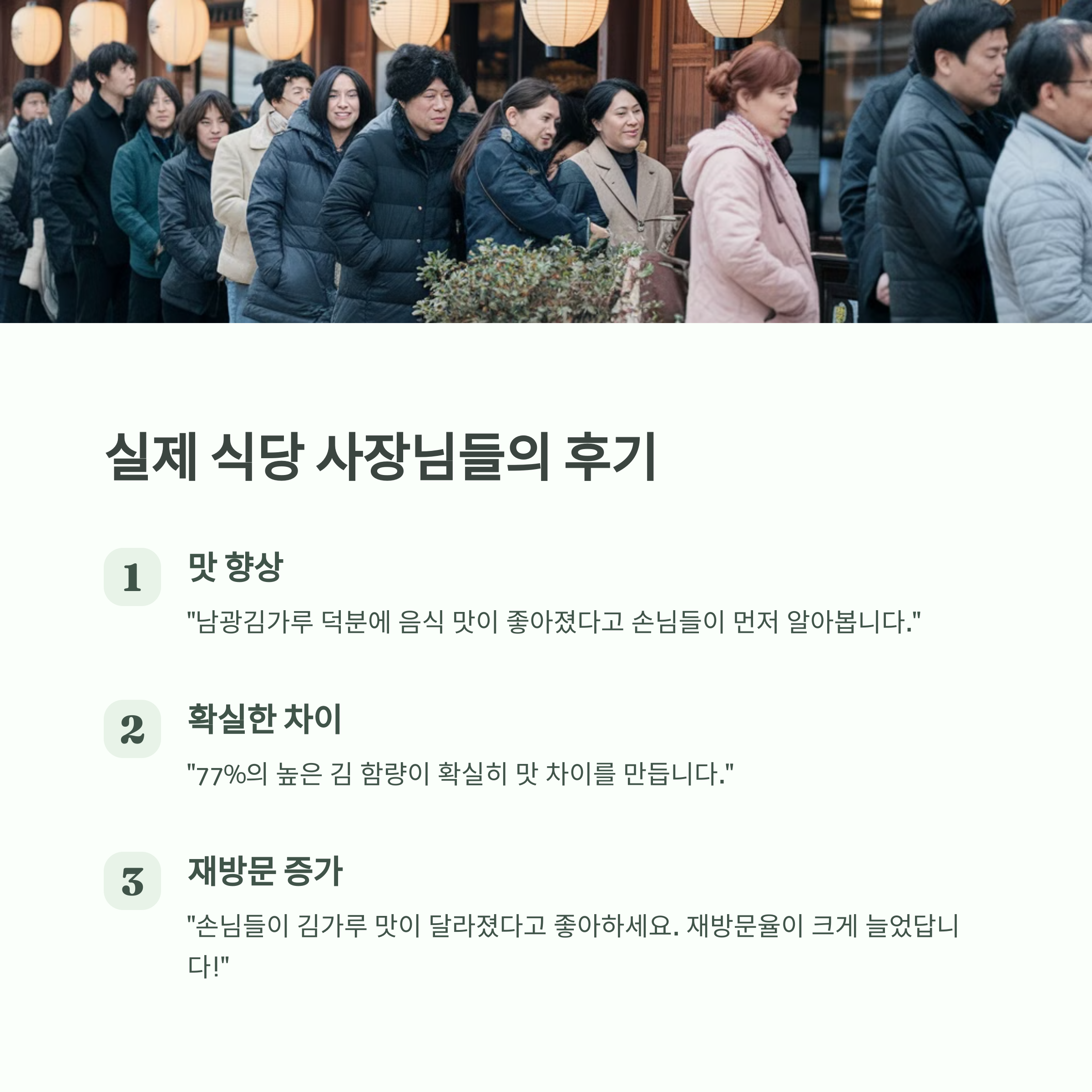 - “남광김가루 덕분에 음식 맛이 좋아졌다고 손님들이 먼저 알아봅니다. 재구매가 계속 늘어나고 있어요!”
