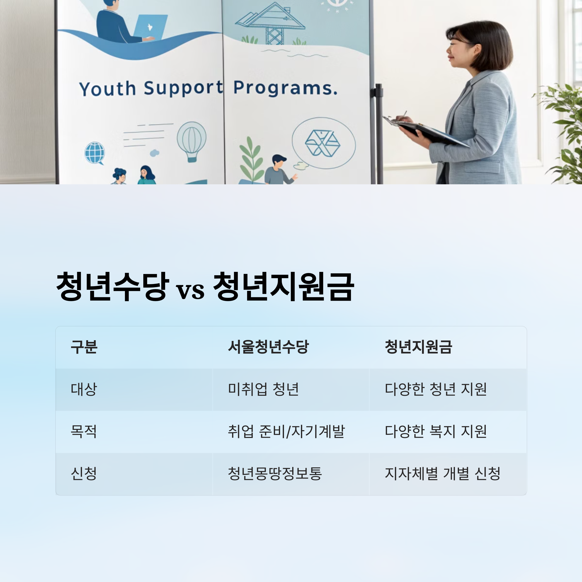 💡 Tip: 청년수당은 서울시에서만 제공하는 반면, 청년지원금은 지역마다 내용이 다르므로 거주 지역의 지원 정책을 꼭 확인하세요!