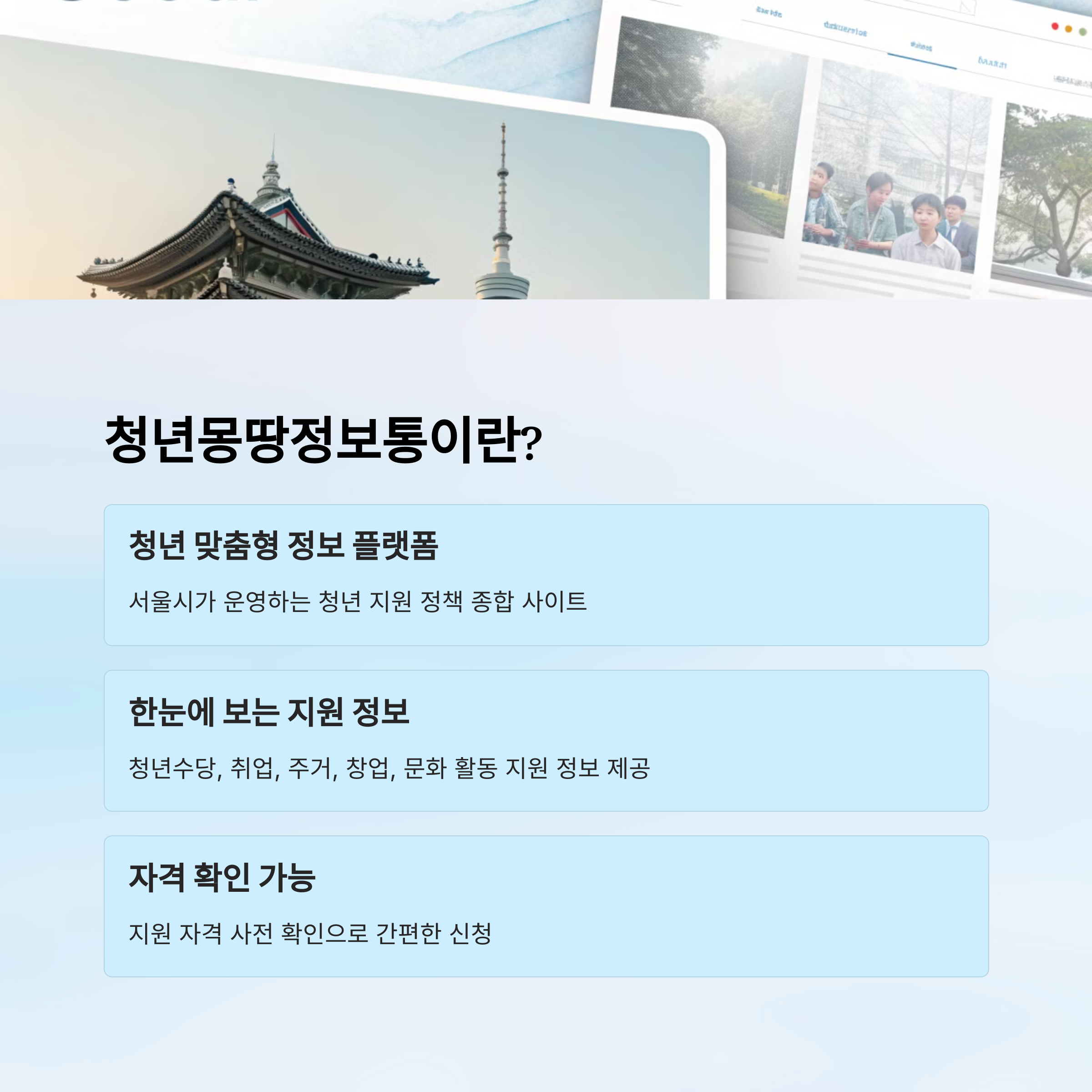 청년몽땅정보통은 서울시가 운영하는 청년 맞춤형 정보 플랫폼으로, 청년들이 필요로 하는 각종 지원 정책과 프로그램을 한눈에 확인할 수 있는 사이트입니다. 🖥️