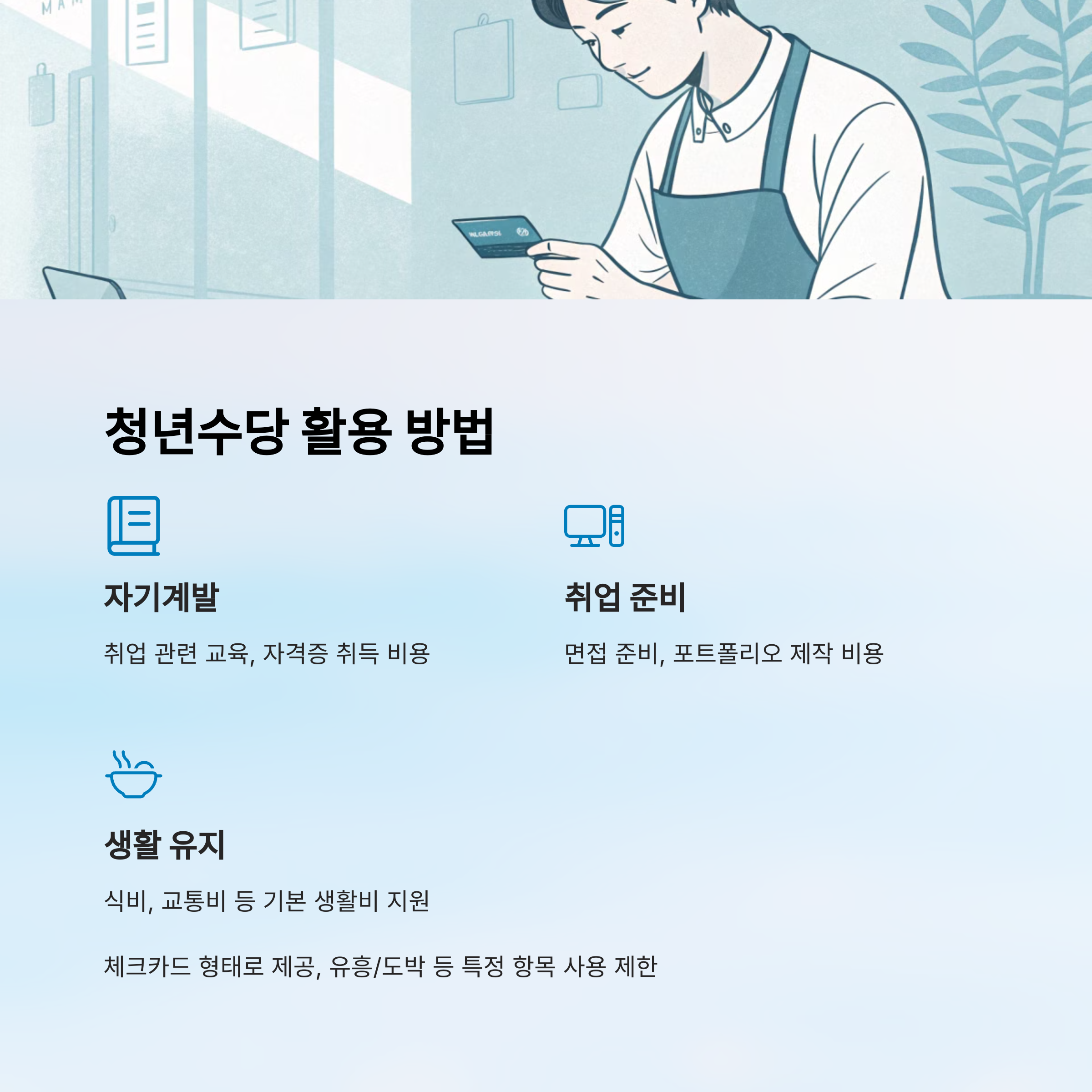 청년수당은 현금 지급이 아니라 체크카드 형태로 제공되며, 특정 항목(예: 유흥, 도박 등)에는 사용할 수 없습니다.