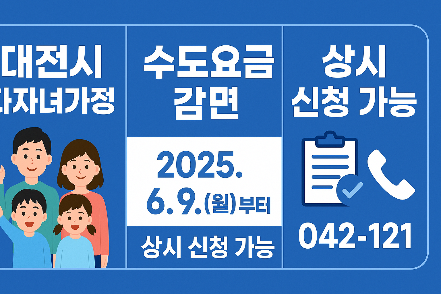 대전광역시는 다자녀가정의 생활비 부담을 줄이기 위해 수도요금 감면 제도를 운영합니다. 2025년 6월 9일부터 상시 신청이 가능하며, 조건을 만족하는 가정이라면 누구나 신청할 수 있습니다.