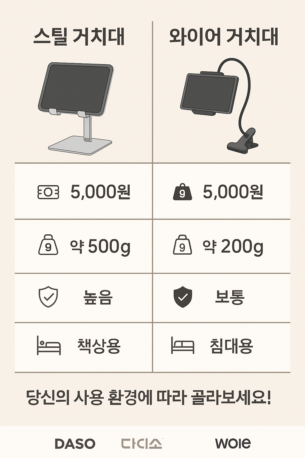 비슷한 가격대의 '와이어형 거치대'와 비교해봤어요. 스틸형은 확실히 고정성이 높고 책상 위에서 안정적인 사용에 최적화돼 있고, 와이어형은 침대나 소파에서 유연한 사용에 유리하더라고요.