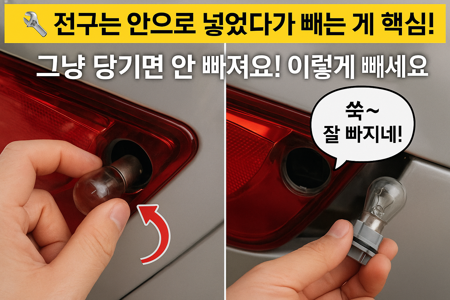 브레이크등 본체에서 전구를 그냥 ‘쭉’ 당기면... 잘 안 빠질 뿐 아니라 파손 위험도 있어요. 이럴 땐 살짝 안쪽으로 밀어 넣은 후, 약간 비스듬한 각도로 잡아당겨 주세요. 그러면 “툭” 빠지는 느낌이 들며 안전하게 분리됩니다. 저도 이 방법 몰라서 한참 씨름했었거든요.
