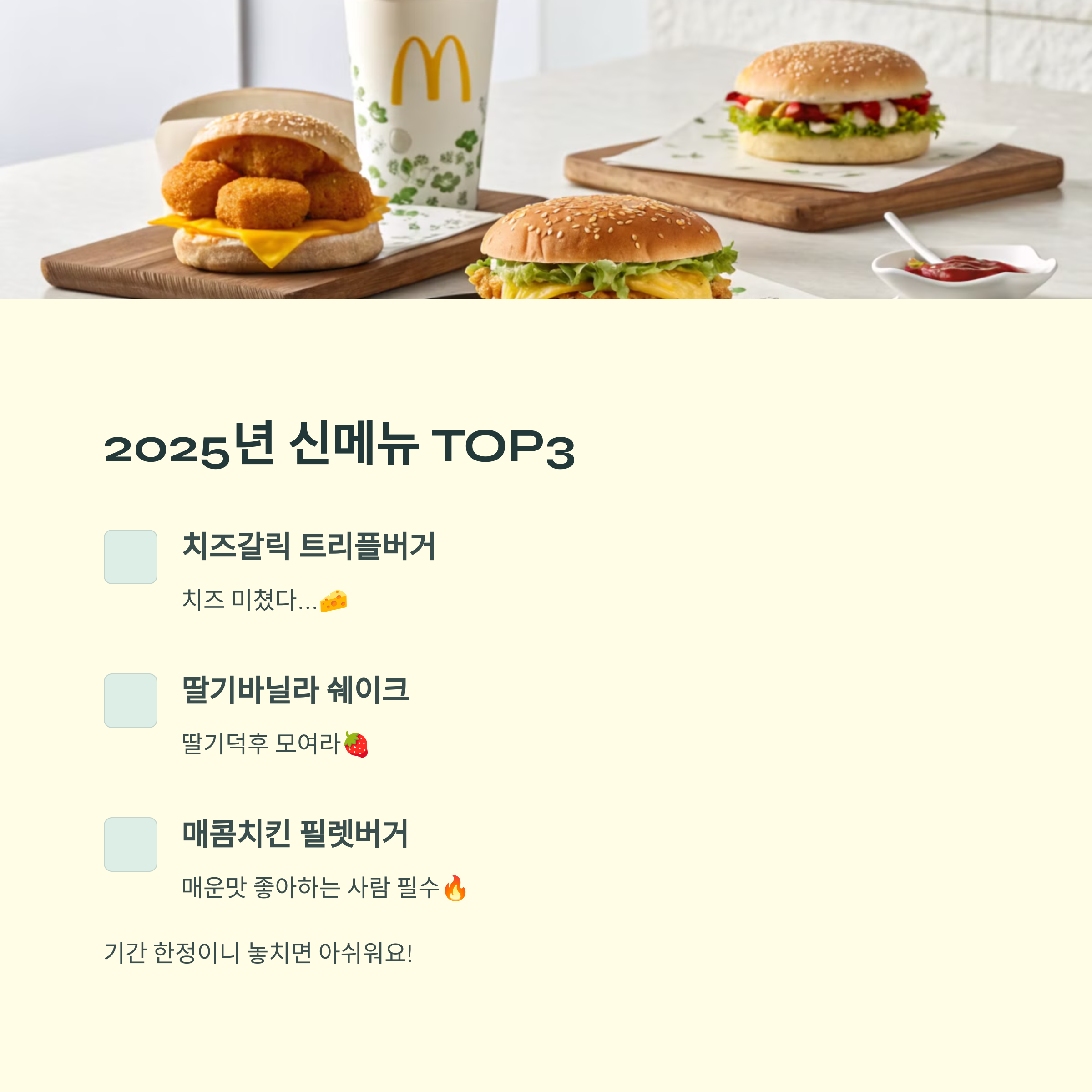 2025년 맥도날드 메뉴 중에서 여러분이 가장 좋아하는 조합은 무엇인가요? 댓글로 남겨주시면 다른 분들의 선택에도 도움이 됩니다! 맛있게 먹는 방법, 추천 꿀조합, 배달 앱 활용법 등 자유롭게 공유해주세요. |