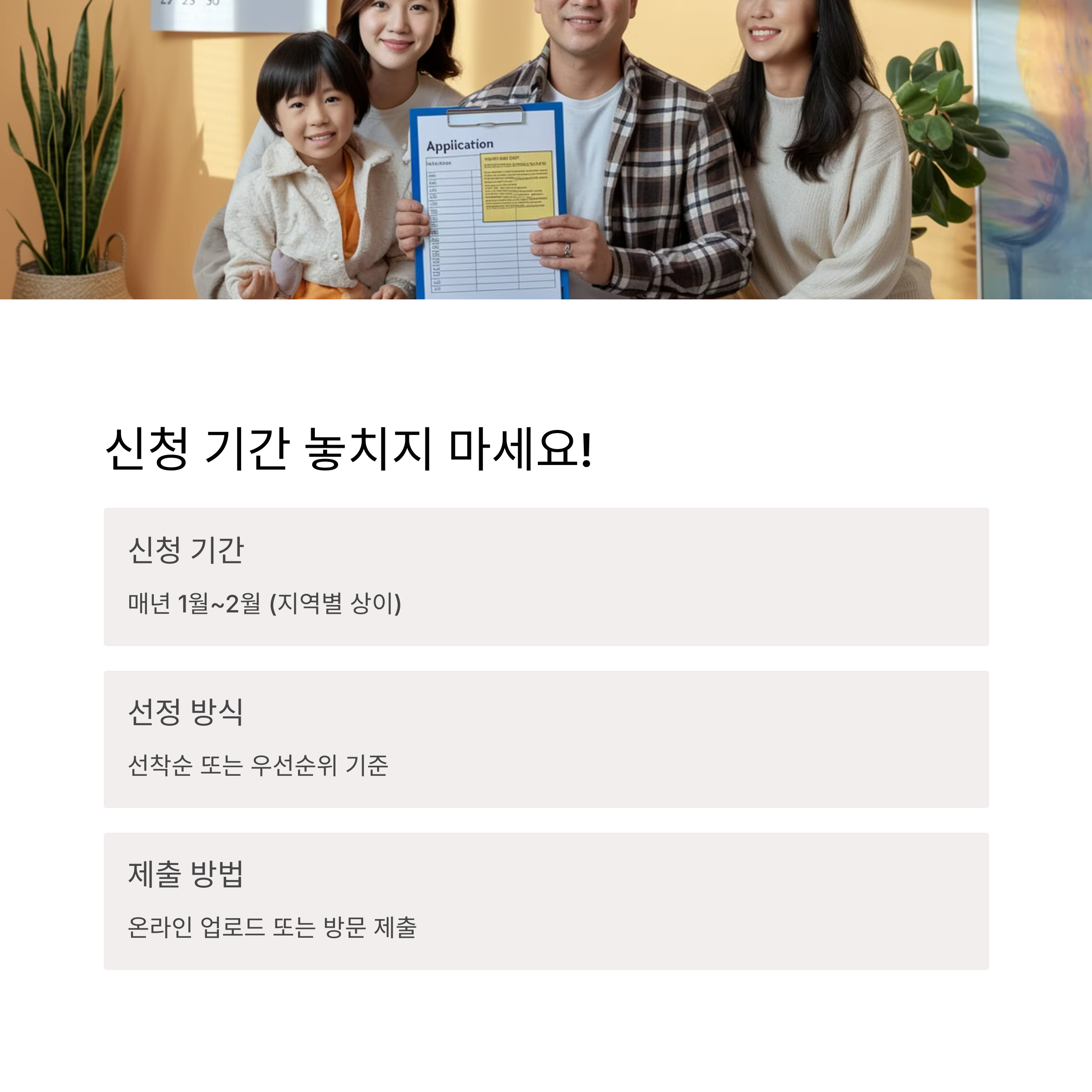신청을 하려면 몇 가지 서류를 꼭 챙기셔야 해요. 그리고 무엇보다도 신청 기간을 놓치지 않는 게 중요합니다! 일반적으로 연초(1~2월)에 모집 공고가 뜨고, 선착순 또는 우선순위 기준으로 선정돼요. 아래 표에 정리해 드릴게요.