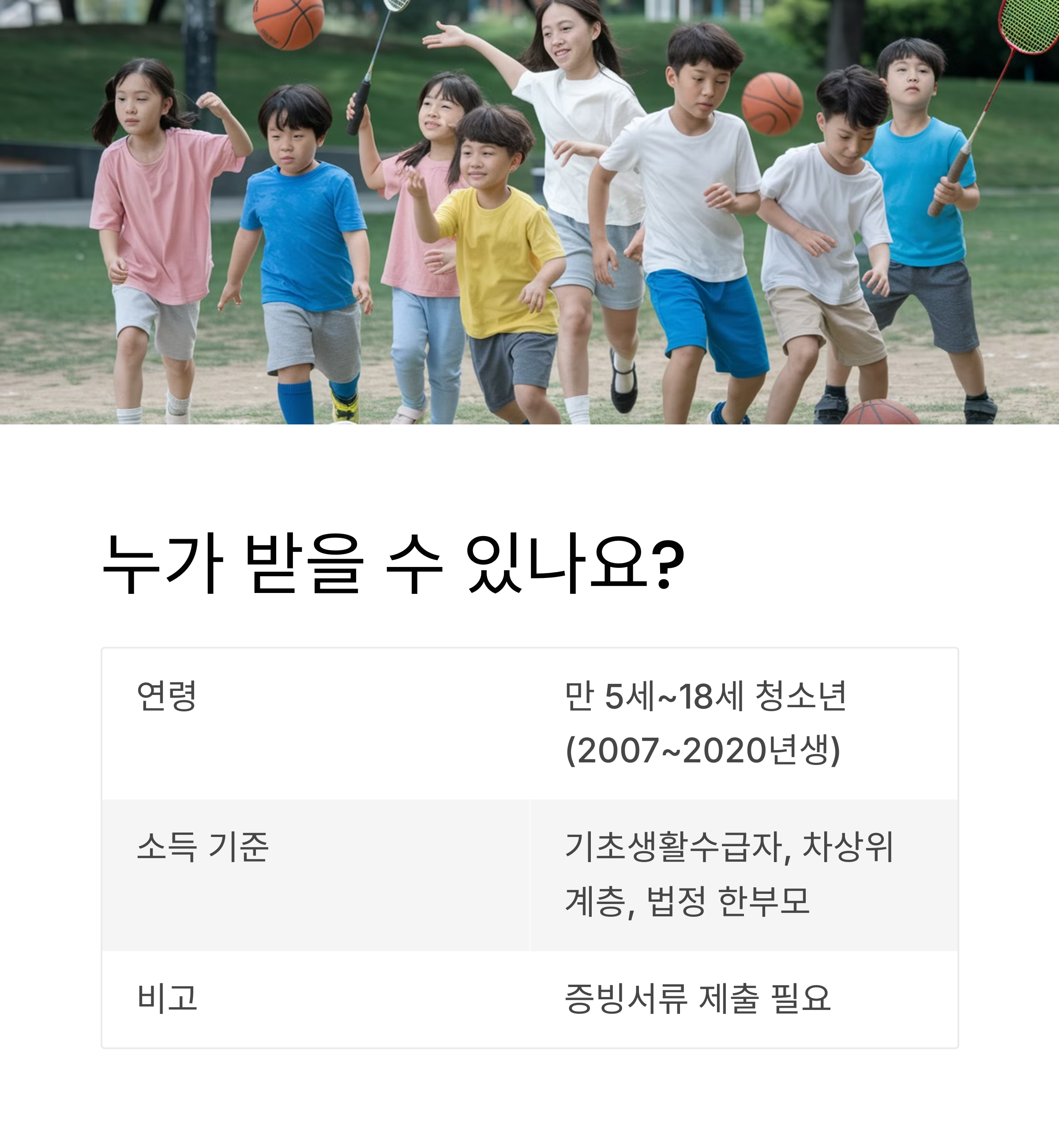 만 5세부터 18세까지의 청소년 중 기초생활수급자, 차상위계층, 한부모가정, 시설아동 등 특정 조건에 해당하면 신청이 가능합니다.