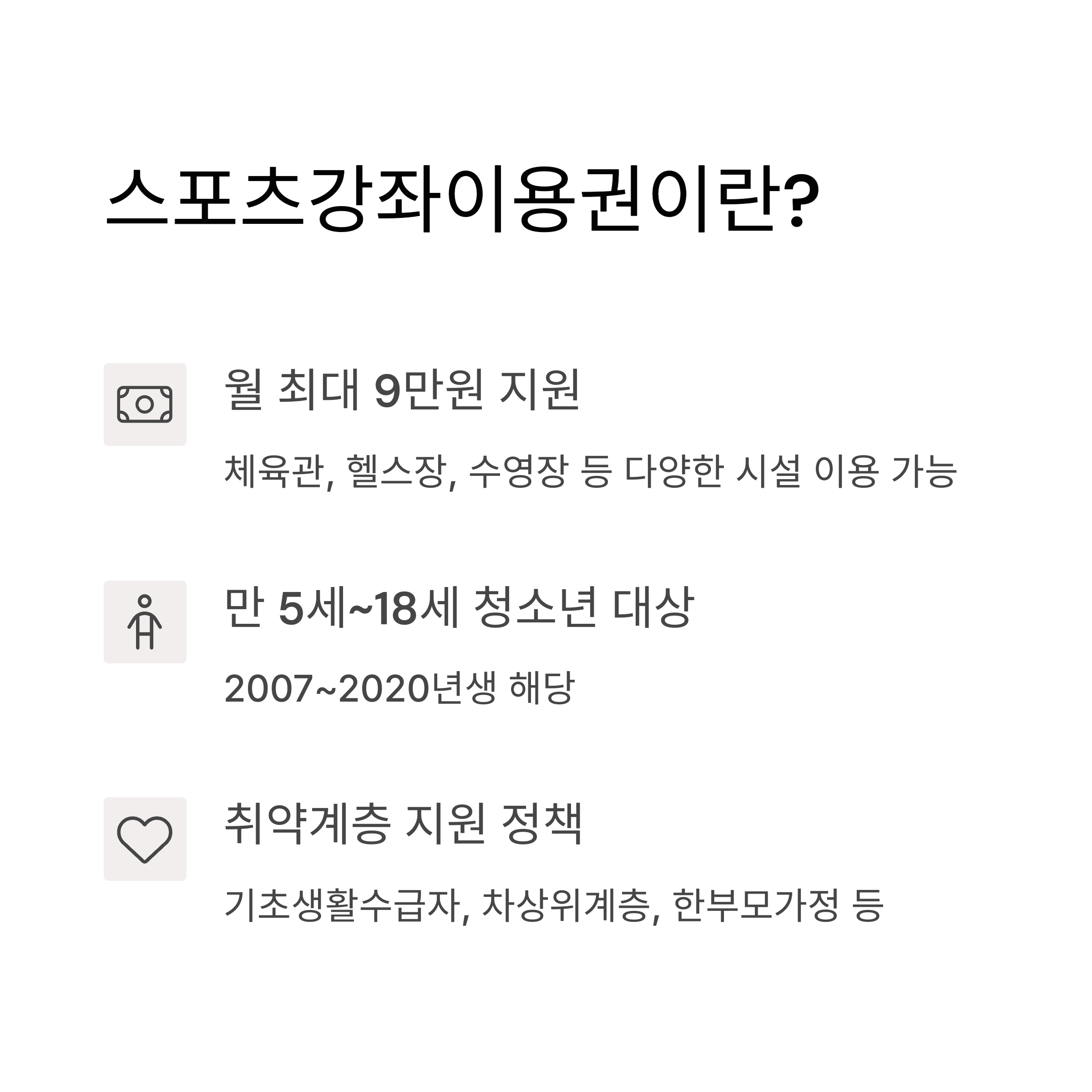 2025년에는 제도가 꽤나 업그레이드됐어요! 예전에는 월 8만원 지원이었는데, 이제는 월 최대 9만원까지 받을 수 있게 되었고요, 대상자 범위도 조금 넓어졌어요. 또 하나 주목할 부분은 이용 가능한 스포츠 기관이 늘었다는 점이에요. 이젠 더 많은 종목과 시설에서 이용권을 쓸 수 있다는 얘기죠!