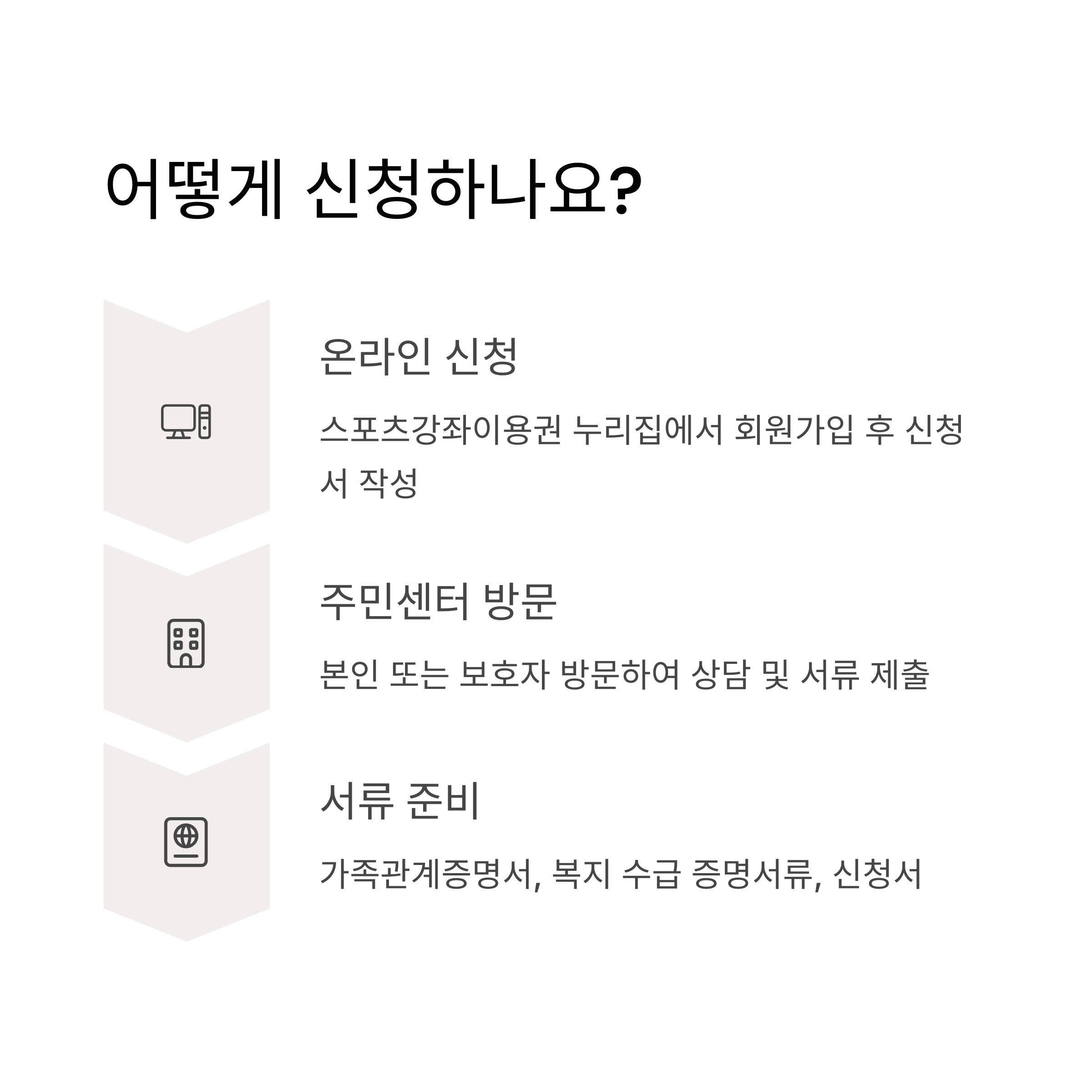 주민센터 또는 스포츠강좌이용권 공식 홈페이지에서 신청할 수 있습니다.