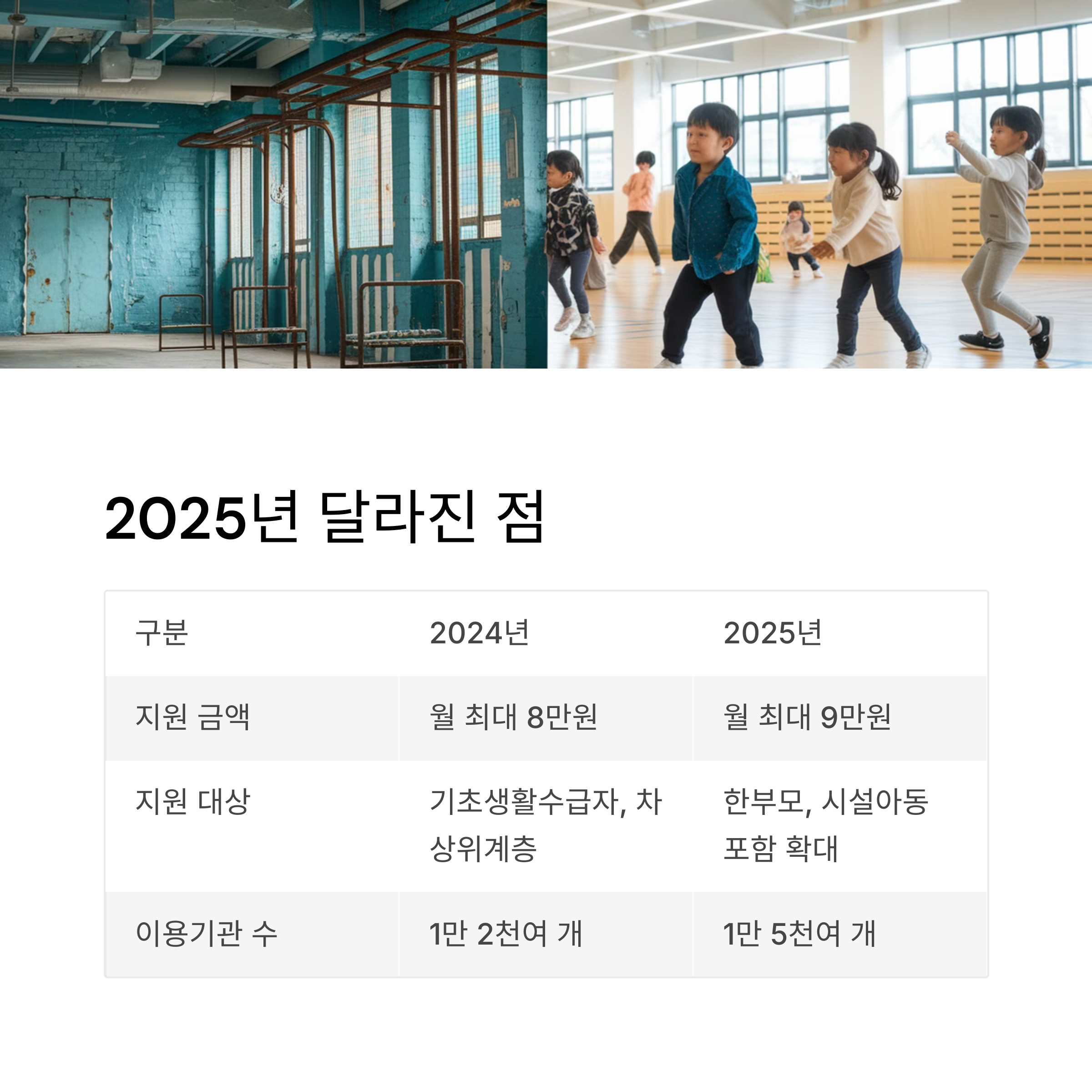 | 지원 대상 | 기초생활수급자, 차상위계층 | 한부모, 시설아동 포함 확대 |
