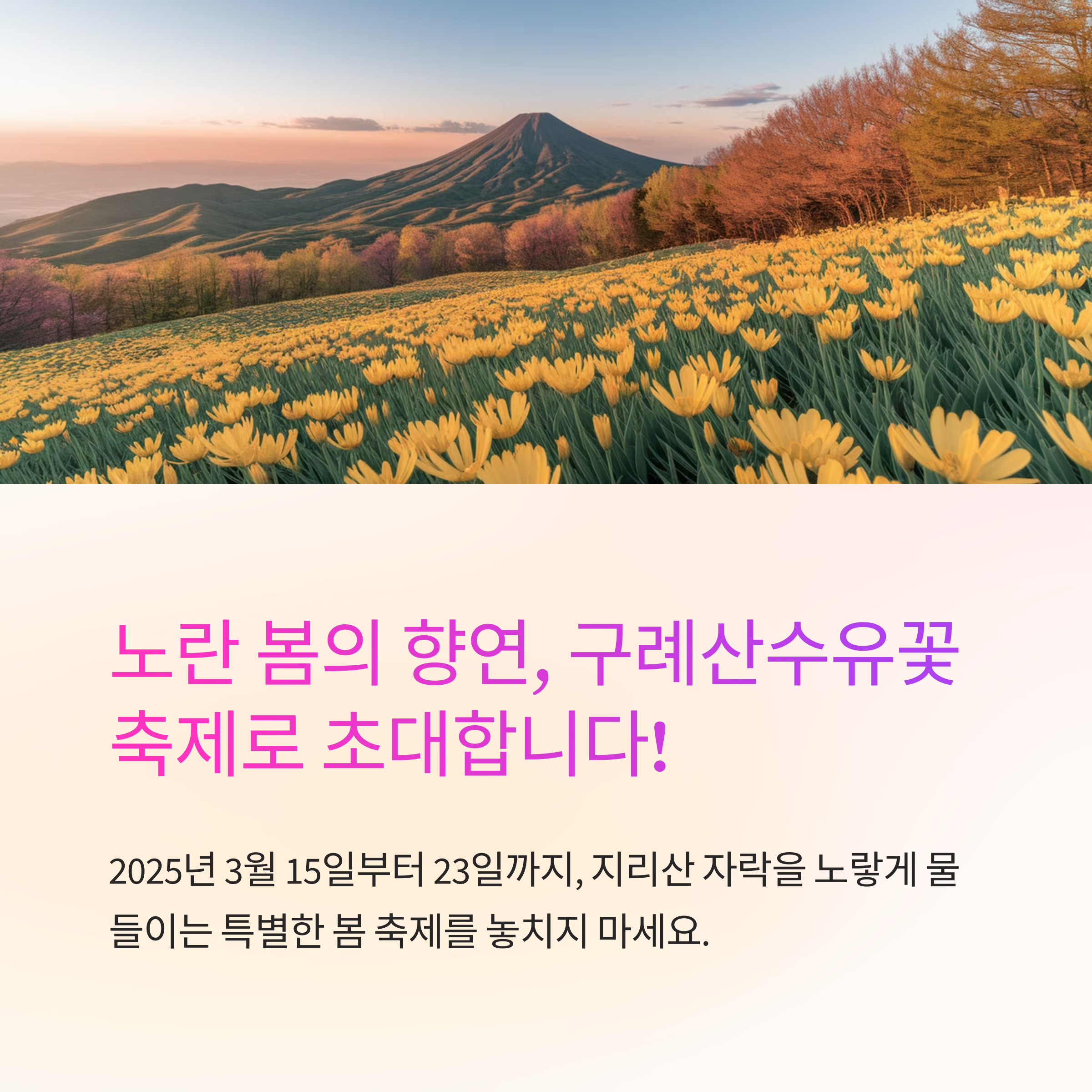 안녕하세요, 봄을 사랑하는 여행자 여러분! 매년 봄이면 전국 곳곳에서 꽃 축제가 열리지만, 그중에서도 전라남도 구례의 산수유꽃축제는 유난히 특별한 의미를 가집니다. 노란 산수유꽃이 지리산 자락을 따라 흐드러지게 피어나며, 따뜻한 봄기운을 물씬 느낄 수 있는 곳이죠. 올해 축제는 2025년 3월 15일(토)부터 3월 23일(일)까지 진행된다고 하니, 봄을 온몸으로 만끽하고 싶은 분들이라면 꼭 한 번 방문해보시길 추천합니다!