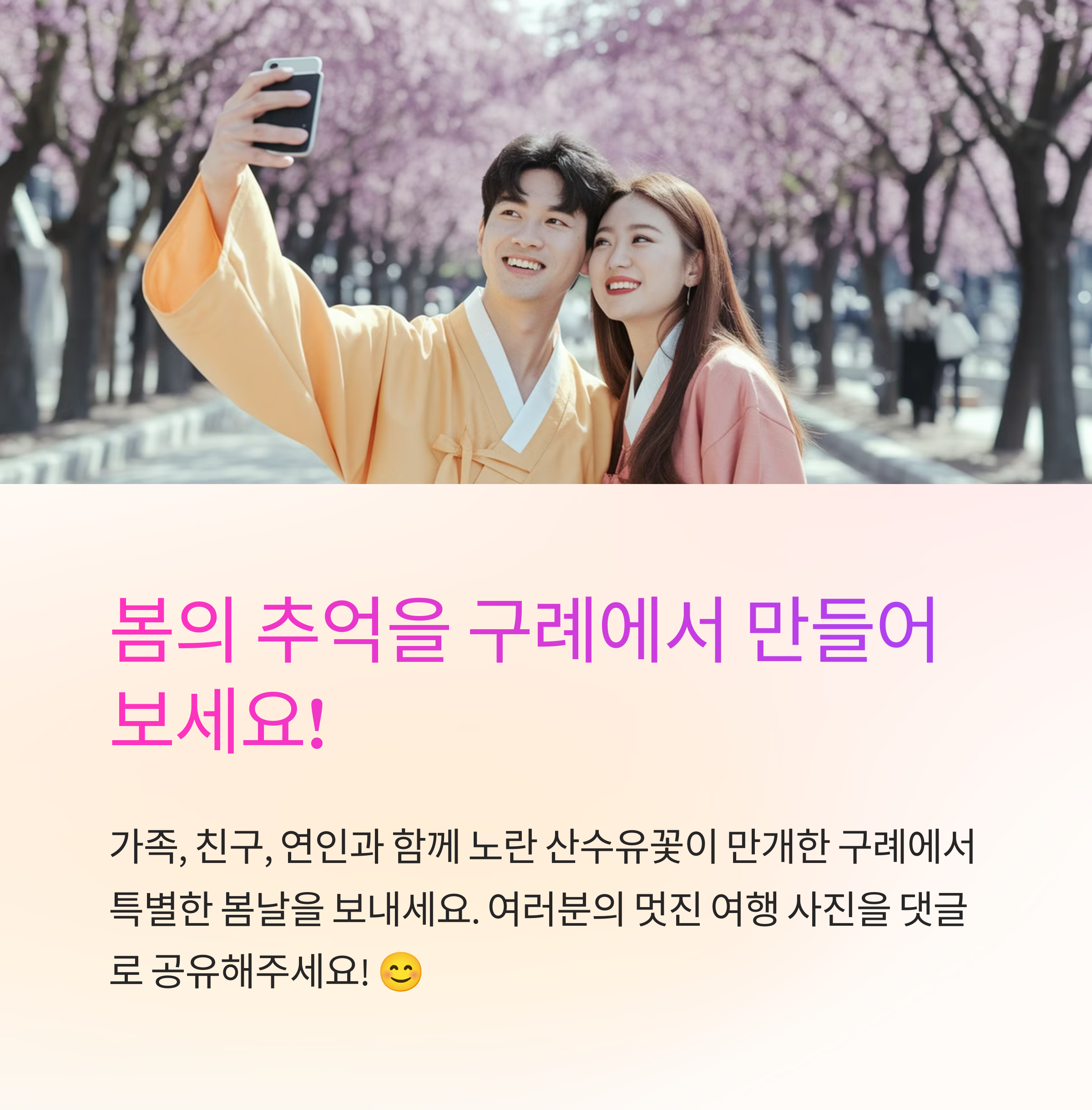 축제 기간 동안 구례는 방문객들로 붐빌 예정입니다. 따라서 미리 교통편과 주차장을 확인하고 이동 계획을 세우는 것이 중요합니다.