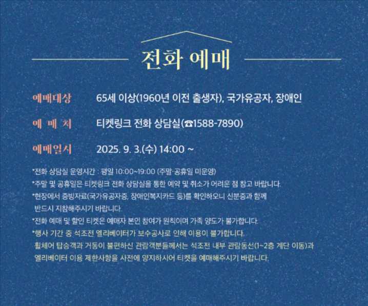 | 전화 예매 대상 | 65세 이상, 국가유공자, 장애인 |