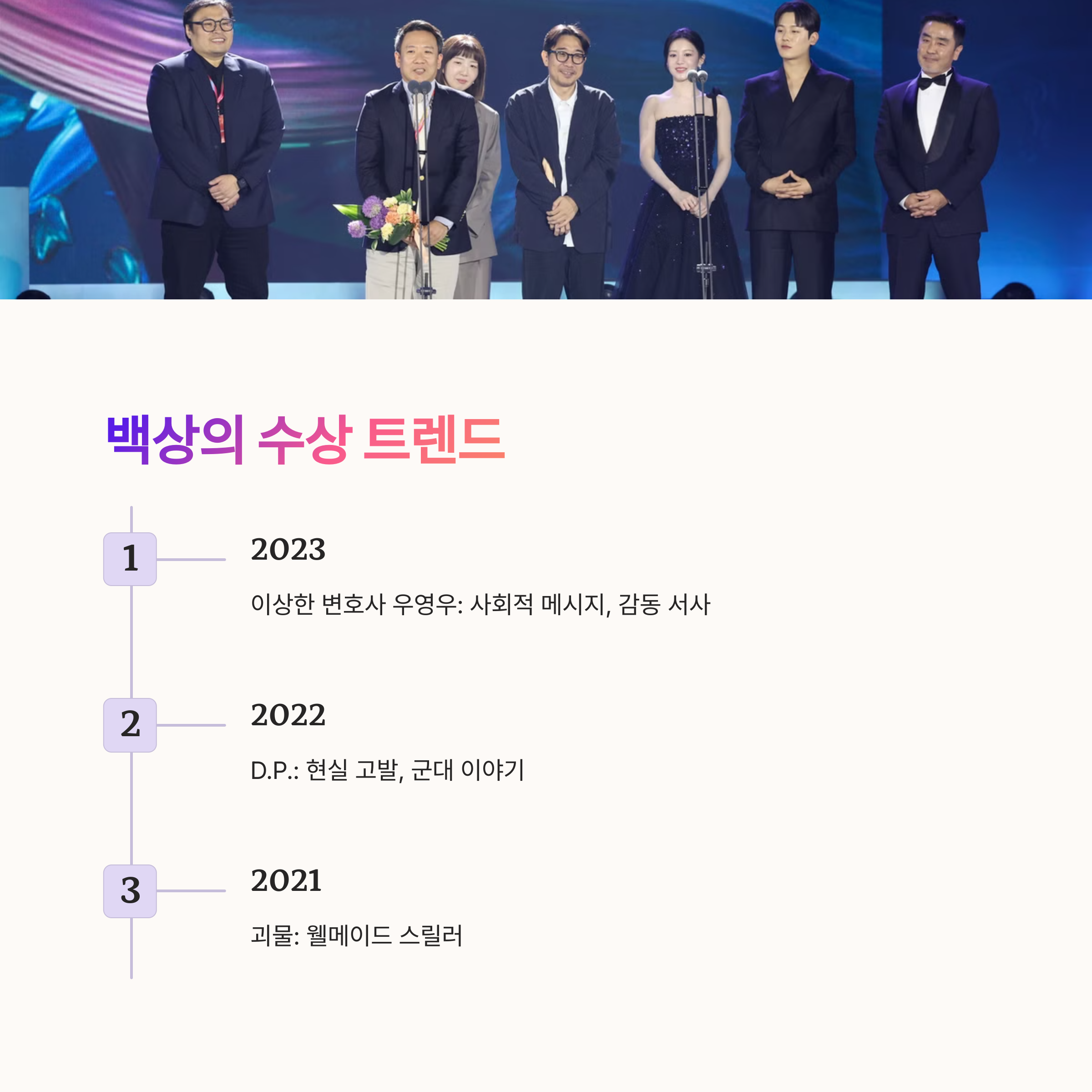 | 2023 | 이상한 변호사 우영우 | 사회적 메시지, 감동 서사 |