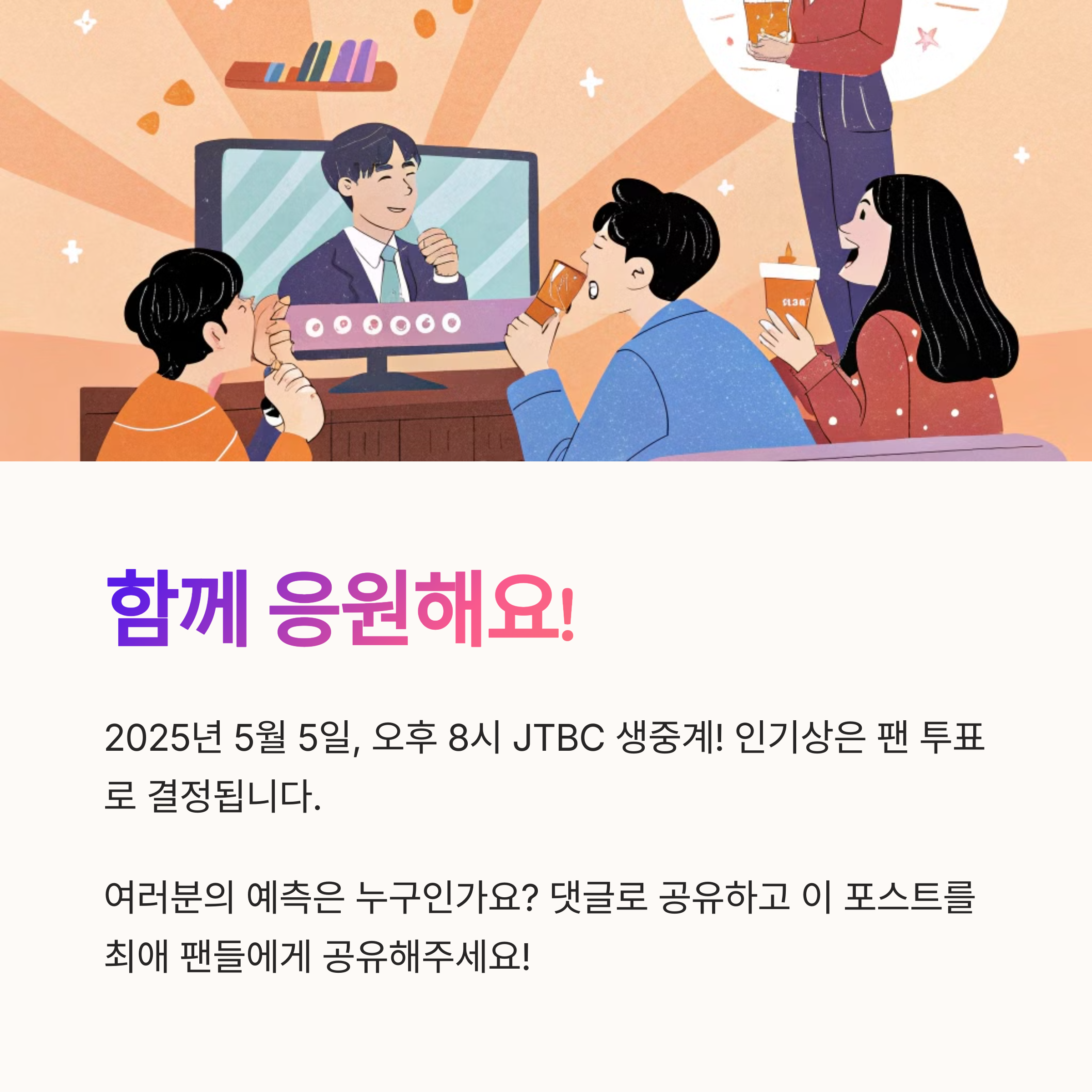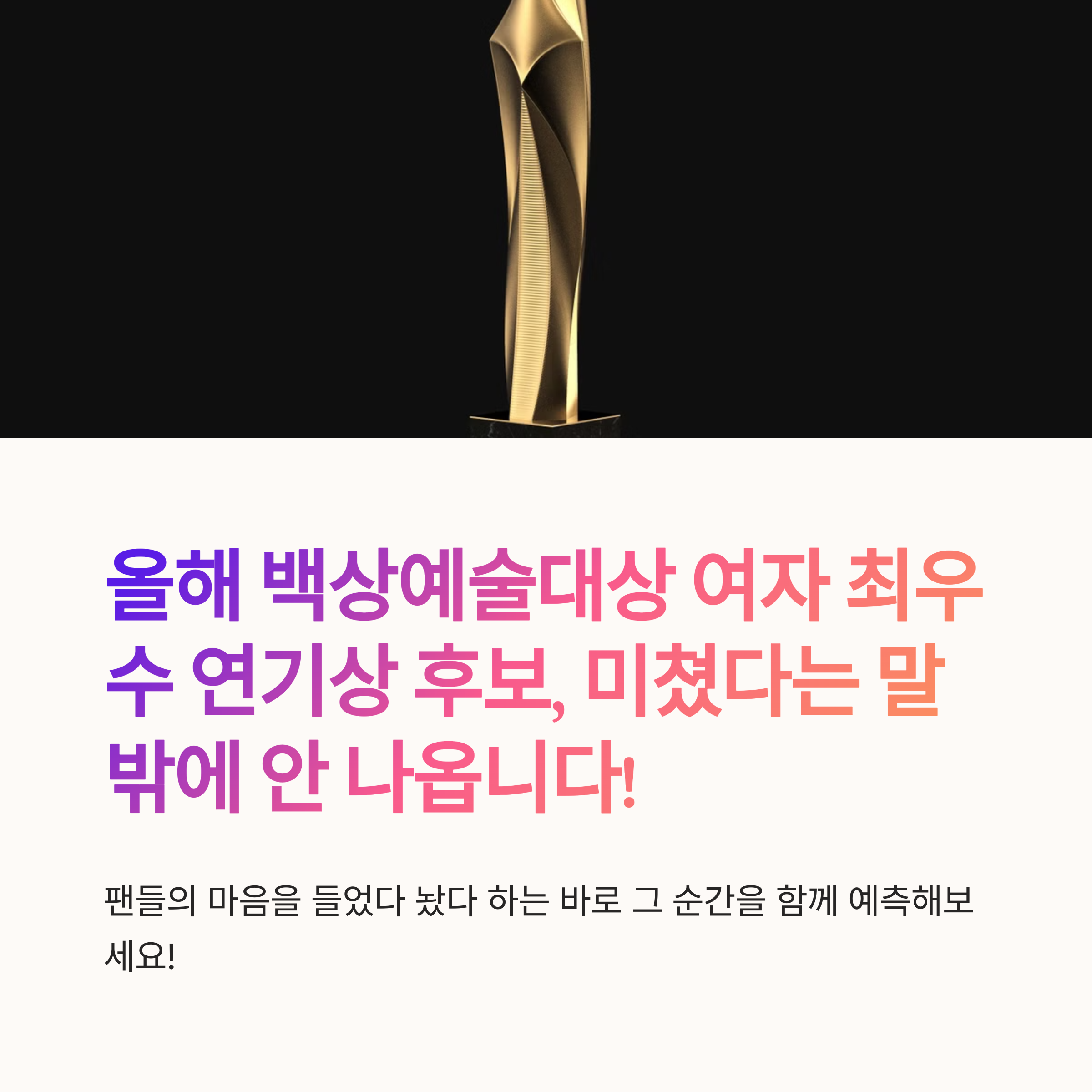 자, 여러분! 벌써부터 백상 예측 열기 장난 아니죠? 😍 누구든 트로피를 들어올려도 이상하지 않은 최고의 배우들이 모인 올해. 그래서 더 기대되고, 더 설렙니다. 우리 함께 본방 사수하고, 내 최애 응원하고, 투표도 꼭꼭 참여해봐요. 그리고 댓글로 여러분의 예측도 들려주세요! 당신의 한 표가 백상 트렌드를 바꿀지도 몰라요 🎬🏆