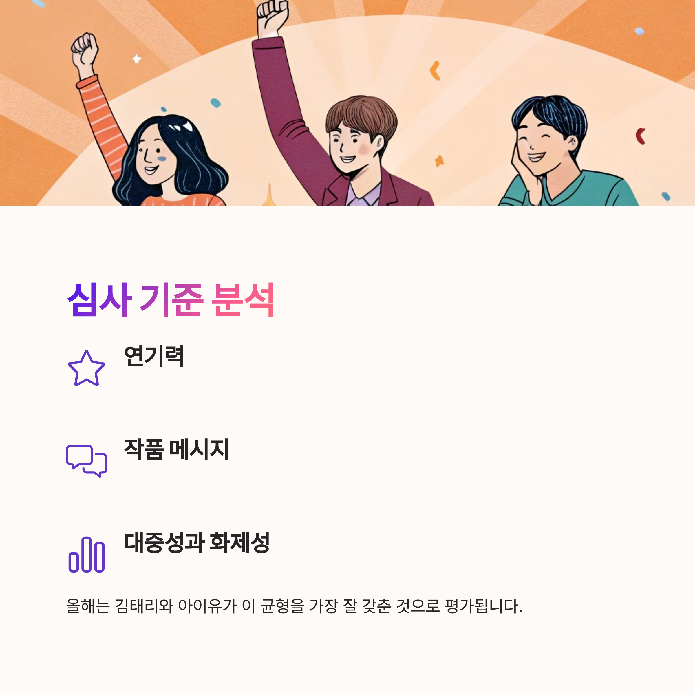 연기력, 작품의 메시지, 대중성, 화제성 등 여러 요소를 종합적으로 판단해 수상자를 선정합니다.