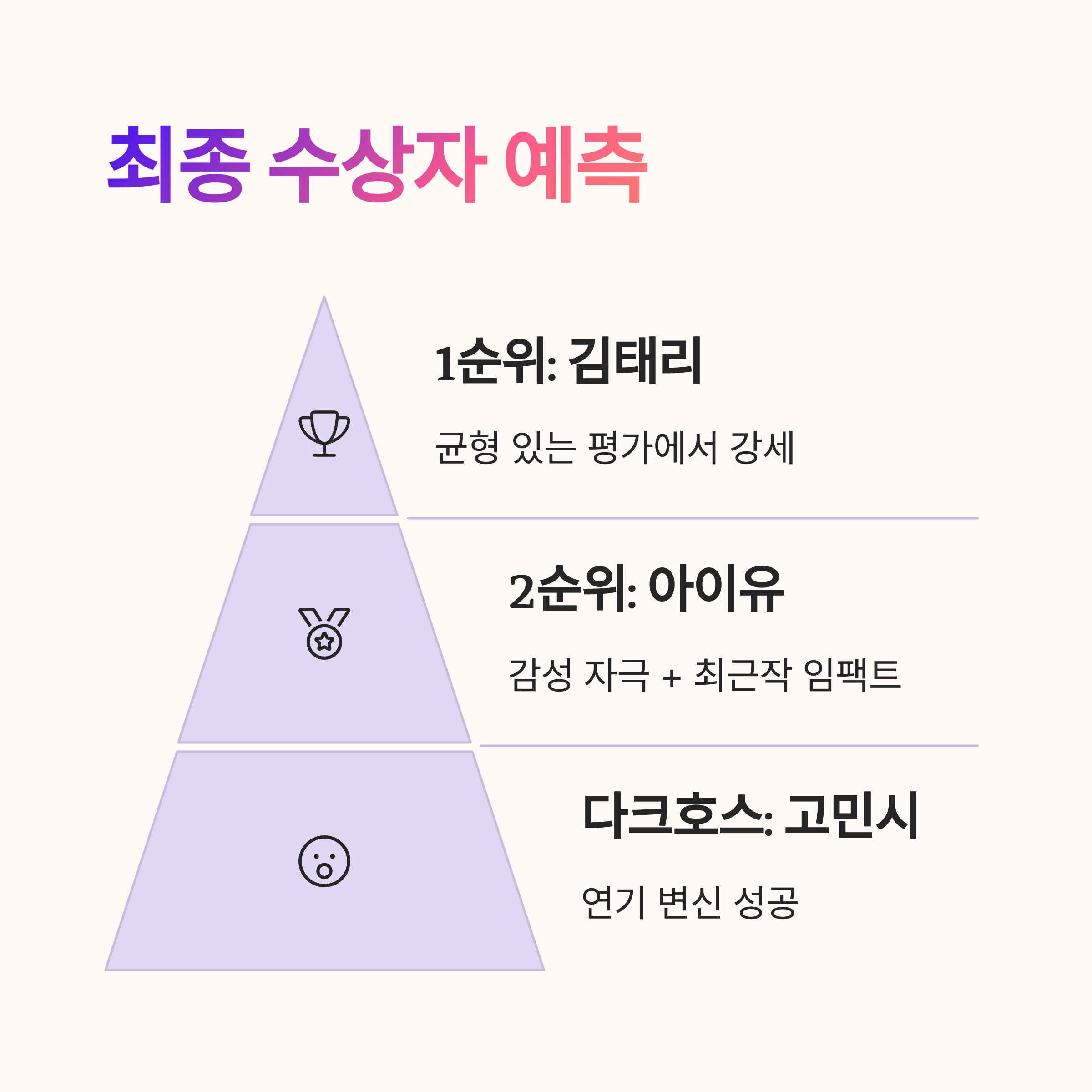 백상은 연기력은 물론 작품의 메시지, 대중성과 화제성까지 종합적으로 평가합니다. 특히 작품성과의 조화를 중요하게 여겨요. 올해 후보 중에서는 이런 균형을 가장 잘 갖춘 배우로 김태리와 아이유가 손꼽히고 있습니다. 고민시는 연기력 자체로 강한 인상을 남겼고, 김혜윤은 대중적 지지가 탄탄합니다. 장나라는 안정감과 내공에서 높은 점수를 받을 수 있겠죠.