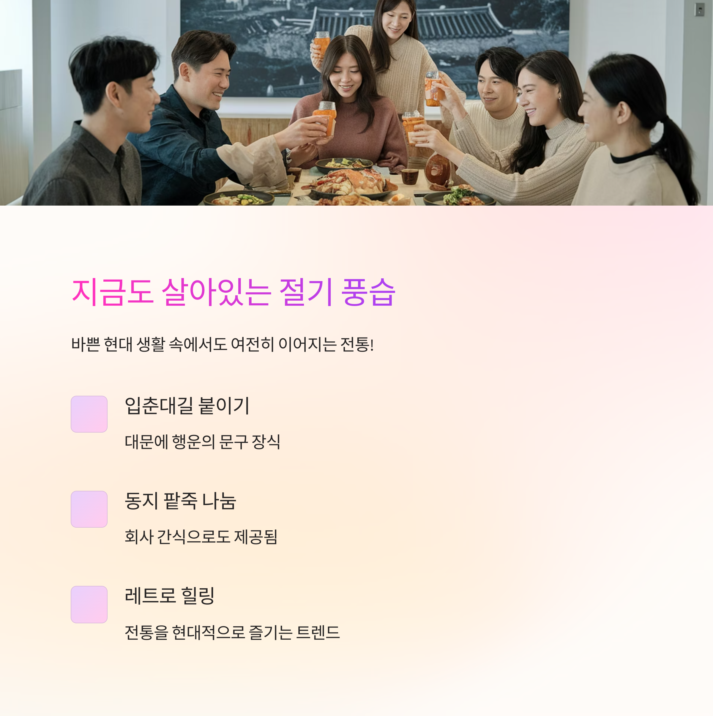 입춘엔 '입춘대길' 문구를 붙이고, 동지엔 팥죽을 나눠 먹는 풍습이 있어요. 요즘은 SNS 이벤트처럼 입춘 스티커 만들기나 레트로 팥죽 만들기 챌린지로 재해석되기도 하죠.