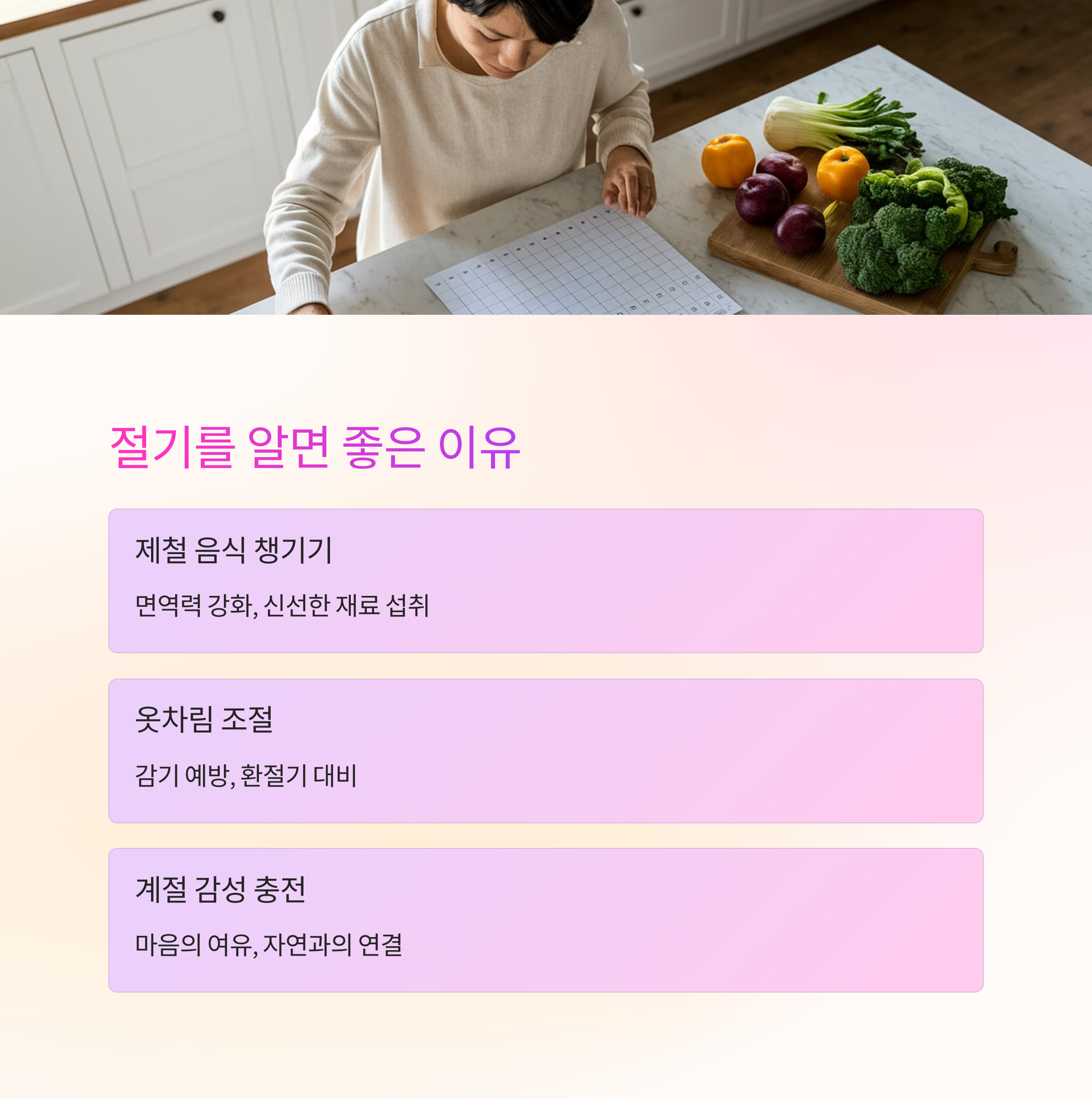 요즘엔 앱이나 뉴스가 잘 돼 있지만, 절기를 알면 제철 음식 챙기기, 옷차림 조절, 건강관리 등에 더 빠르게 대응할 수 있어요. 특히 농촌 지역에선 지금도 절기 달력으로 일정을 조율하기도 한답니다.