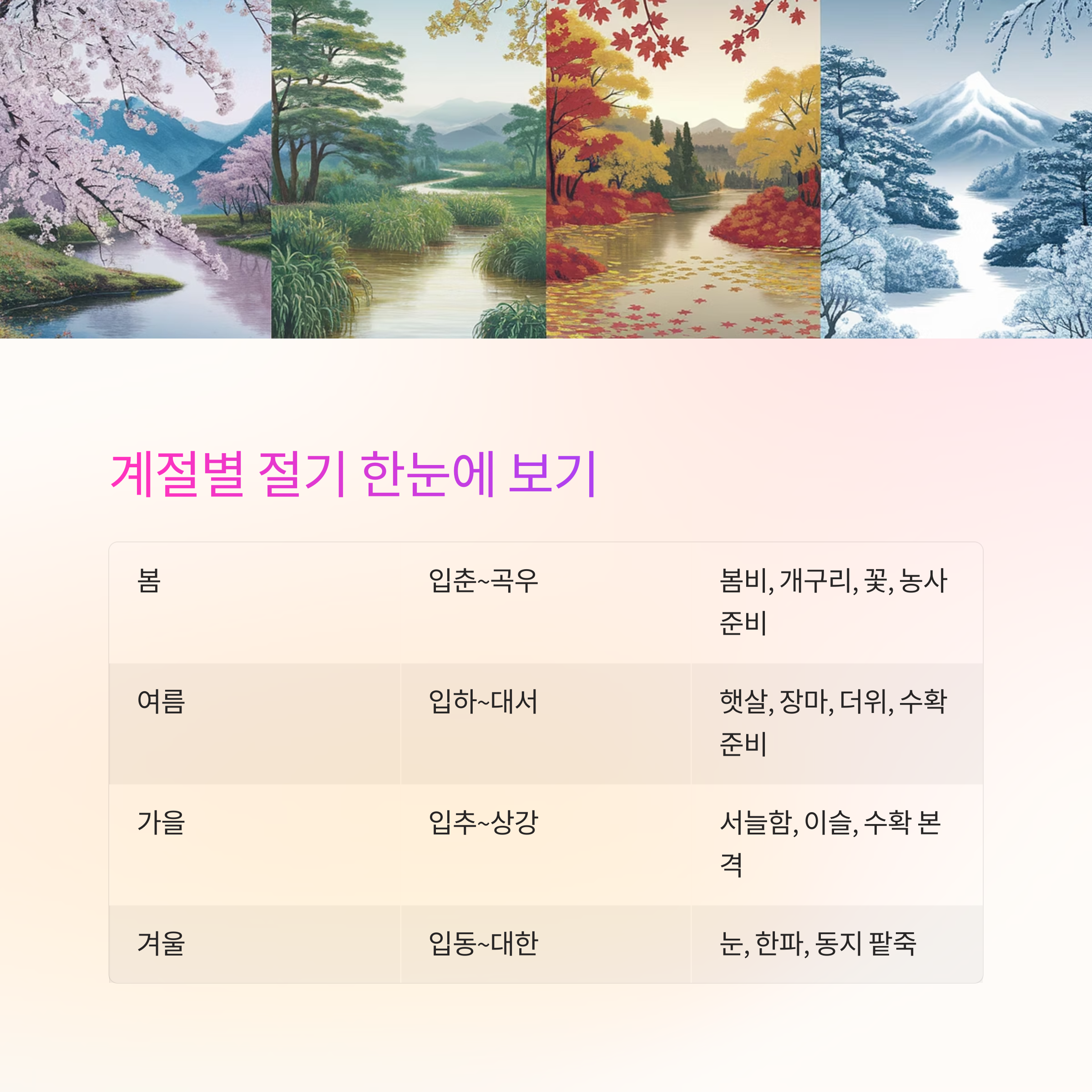 안녕하세요! 요즘처럼 계절이 훅훅 바뀌는 날씨에, 도대체 뭘 입어야 할지 헷갈릴 때 많죠? 저도 아침마다 옷장 앞에서 한참을 서 있어요. 그러다 문득 떠오른 게 "24절기"였답니다. 어릴 적 어르신들께 자주 듣던 말이라 그냥 옛날 이야기인 줄만 알았는데, 다시 보니 이거 완전 생활 밀착형 캘린더더라구요! 그래서 오늘은 입춘부터 대한까지, 우리 삶 속에서 여전히 살아 숨 쉬는 24절기의 지혜를 재미있고 실용적으로 풀어보려고 해요.