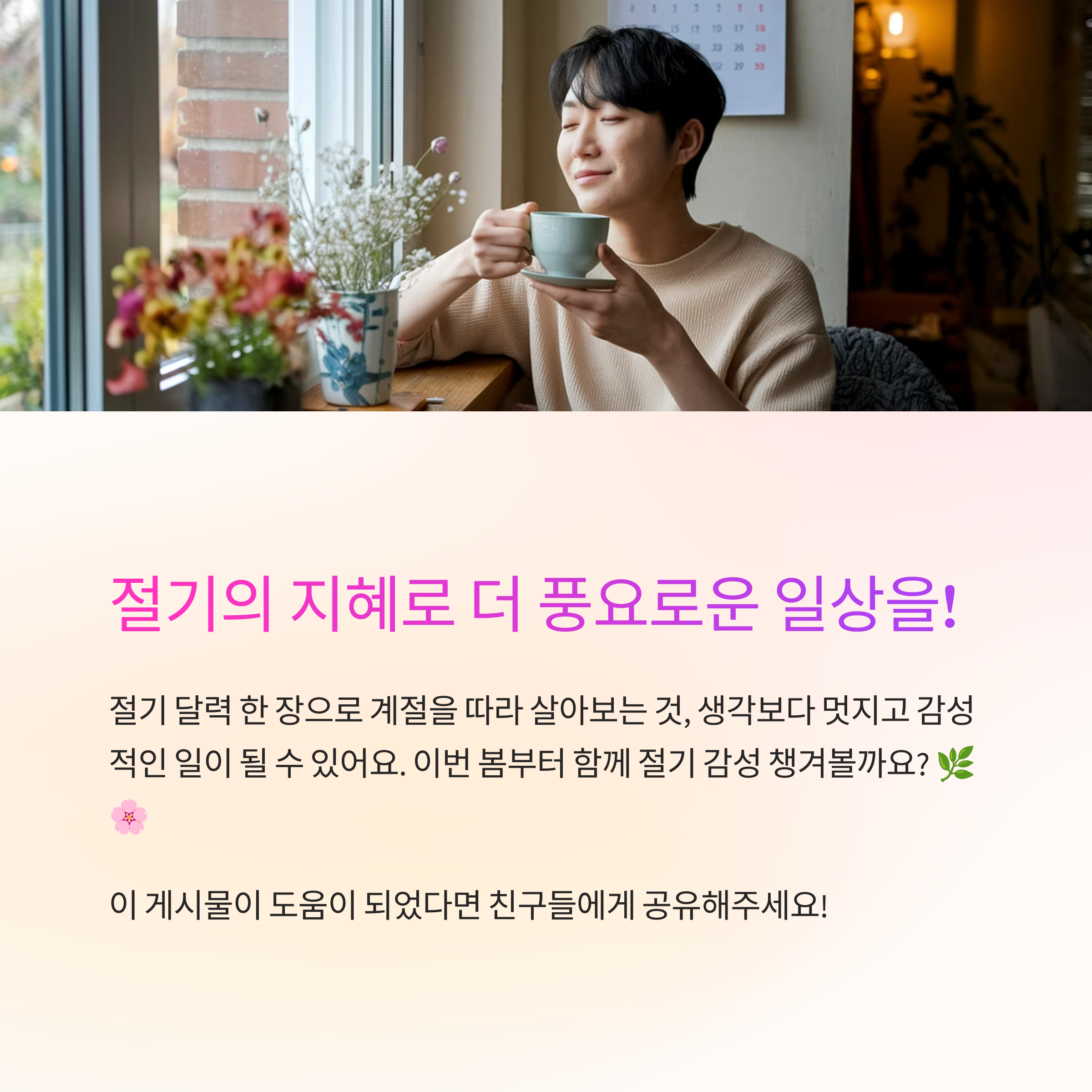 말로만 절기 챙긴다고 하지 말고, 올해는 아예 절기 달력을 출력해서 붙여보는 건 어때요? 생각보다 귀엽고 인테리어 효과도 있고, 매달 절기마다 작은 루틴을 실천하면 일상에 리듬도 생겨요!