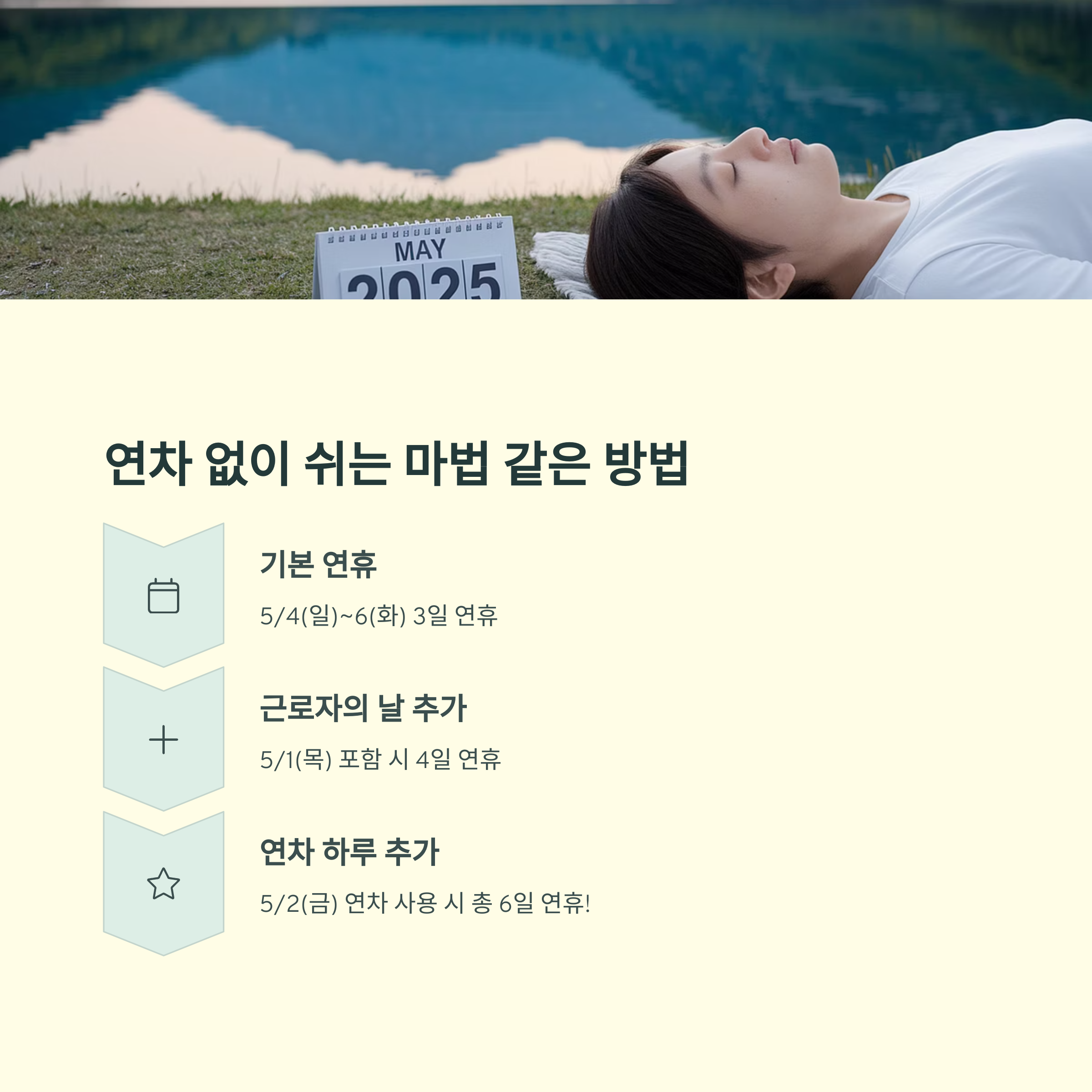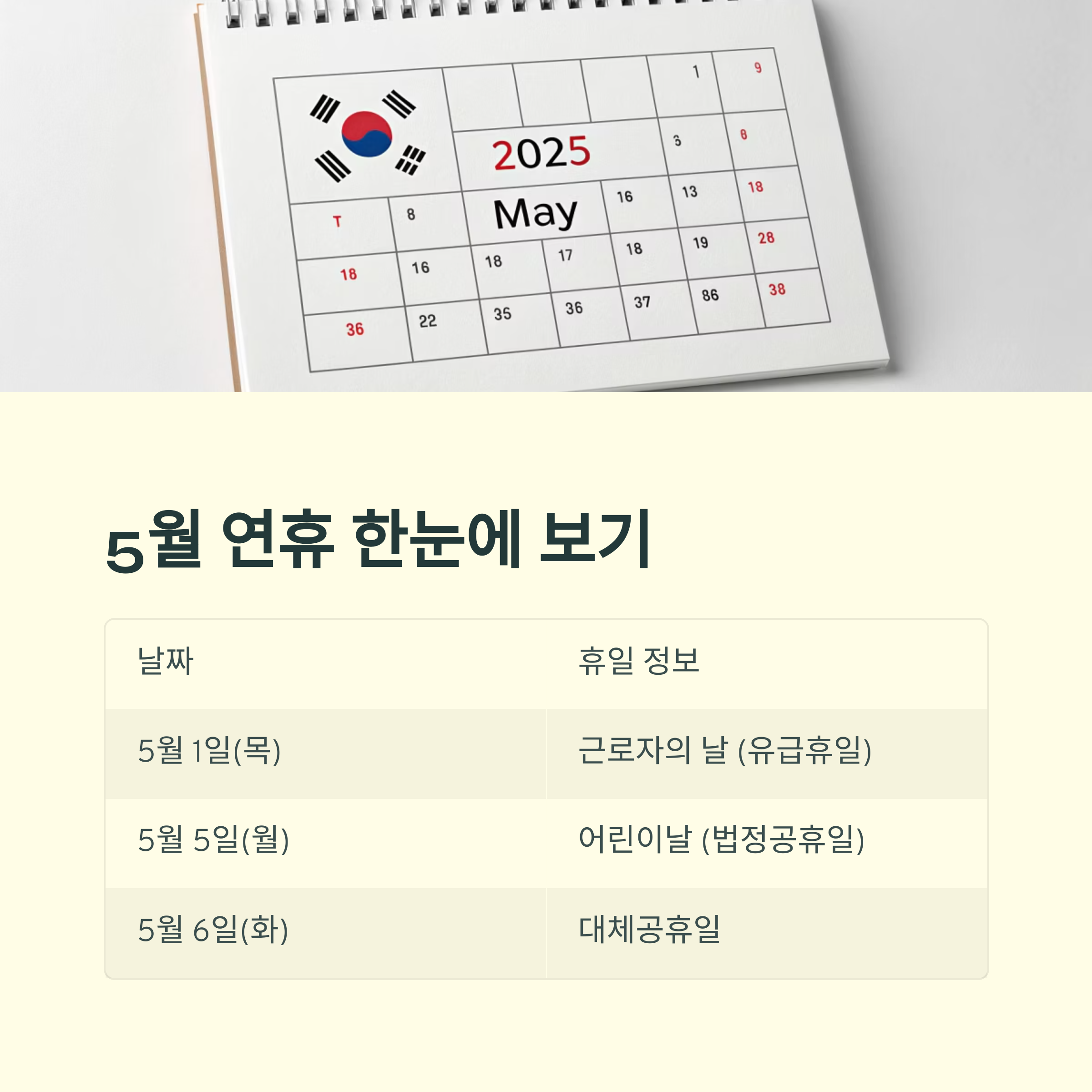 여러분 안녕하세요! 봄바람 솔솔 부는 5월이 코앞으로 다가왔네요. 저는 요즘 달력을 보다가 깜짝 놀랐어요. 올해 5월 1일이 목요일인데, 어린이날과 부처님오신날이 월요일이라 그 다음날인 5월 6일(화)이 대체공휴일로 지정되었더라고요! 그래서 이번 글에서는 연차 없이도 최대 5일을 쉴 수 있는 꿀조합을 소개해보려고 해요. 놓치면 정말 아쉬울지도 몰라요. 바로 시작할게요!