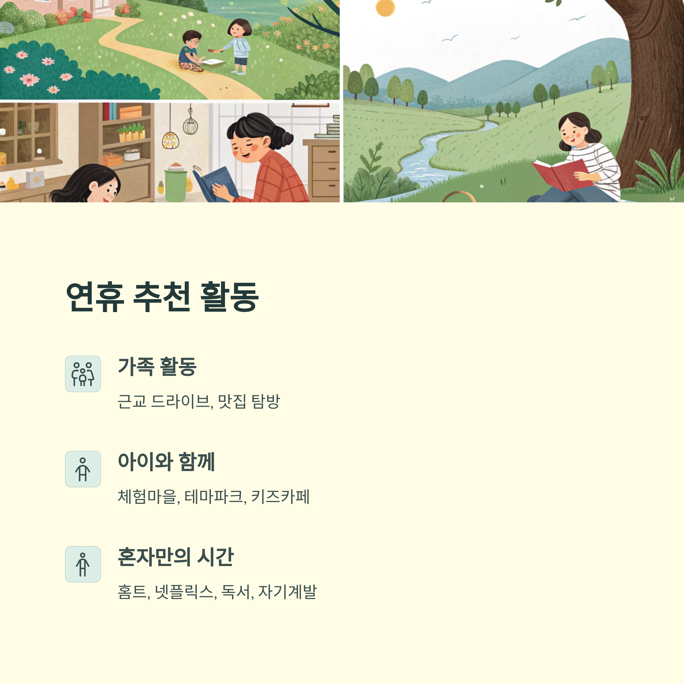 이번 연휴엔 뭐 할지 정하셨나요? 아직이라면 아래 추천 리스트에서 아이디어 얻어보세요. 가족끼리, 연인끼리, 또는 혼자서도 충분히 즐길 수 있는 알찬 일정들이에요!