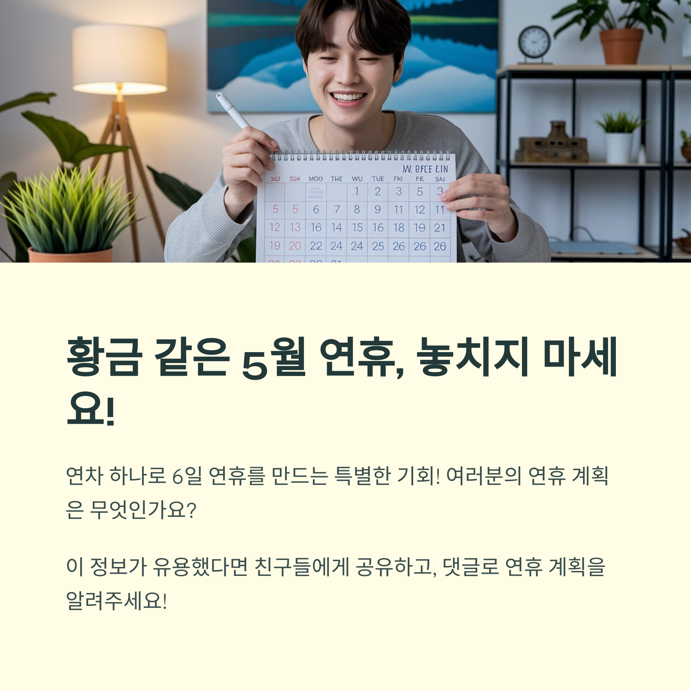 이번 5월은 진짜 놓치기 아까운 황금 기회예요! 연차 없이도 최소 3일, 근로자의 날까지 쉬면 4일, 연차 하루만 써도 무려 6일이나 쉴 수 있다는 사실! 저는 이번 기회에 속초 바다 보면서 힐링하고 올 생각인데요, 여러분도 꼭 달력 체크하시고 알차게 계획 세워보세요. 댓글로 여러분의 연휴 계획도 나눠주시면 함께 꿀팁 나누는 재미가 쏠쏠할 거예요 :)