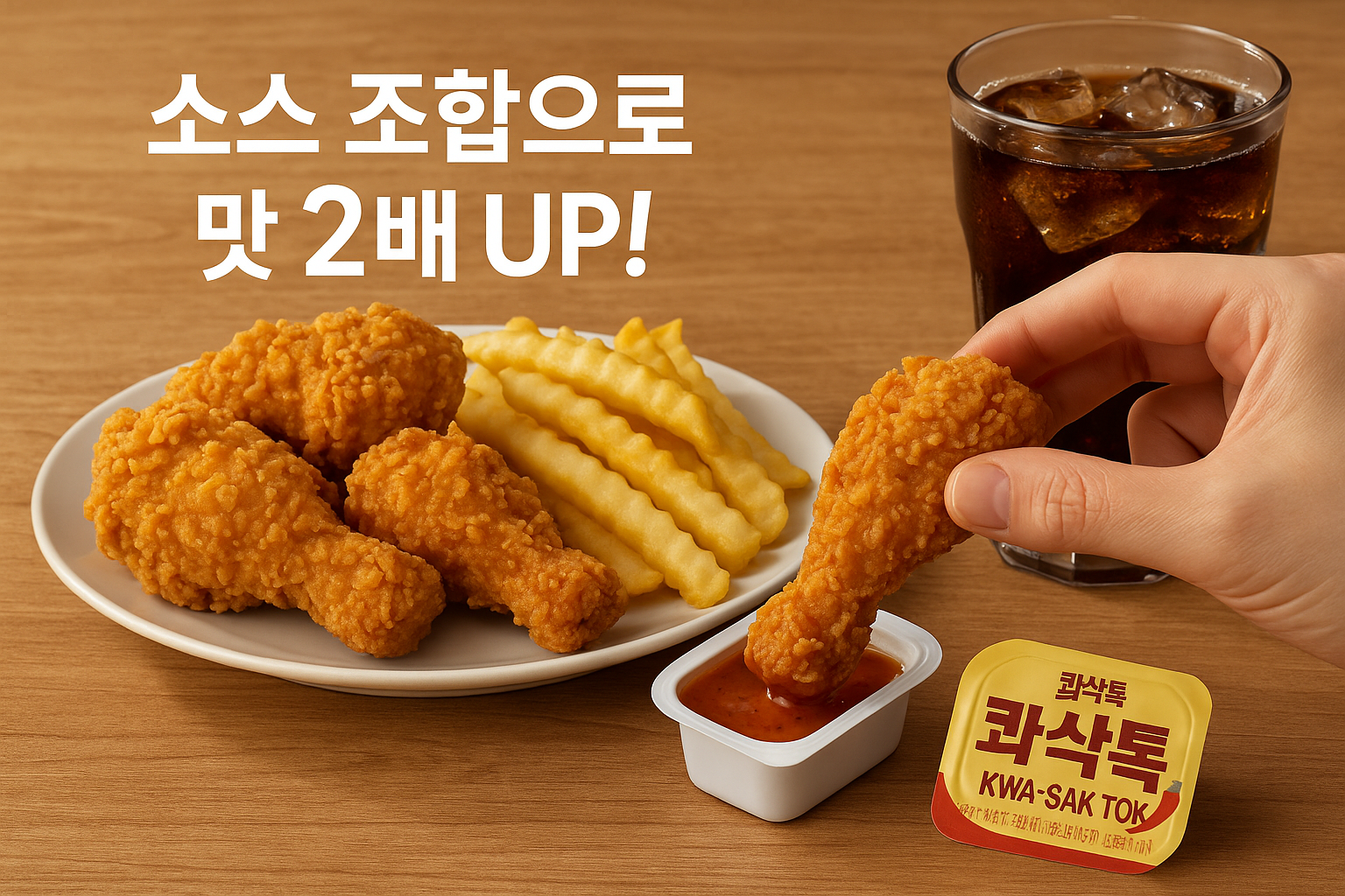 콰삭킹은 기본적으로 담백하고 고소한 후라이드 맛이 베이스예요. 그런데 여기에 BHC에서 제공하는 콰삭톡 소스팩이나 톡톡팩을 곁들이면 또 다른 차원의 맛이 펼쳐지죠. 콰삭톡은 매콤한 맛, 톡톡팩은 달콤짭짤한 맛을 더해주는데요. 저는 둘 다 뿌려 먹어봤는데, 소스와 함께 먹을 때마다 완전히 새로운 메뉴처럼 느껴졌어요. 취향에 따라 아예 소스 없이 담백하게 먹는 것도 좋지만, 다양한 풍미를 즐기고 싶다면 꼭 한번 시도해보세요!