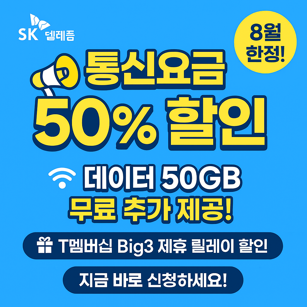크게 보면 세 가지 혜택으로 구성되어 있어요. 신청만 하면 바로 8월 한 달 통신 요금 50% 할인! 그리고 데이터도 빵빵하게 매달 50GB 추가 제공! 거기에 T멤버십 제휴사 릴레이 할인까지 있으니 알뜰하게 쓰실 수 있답니다.